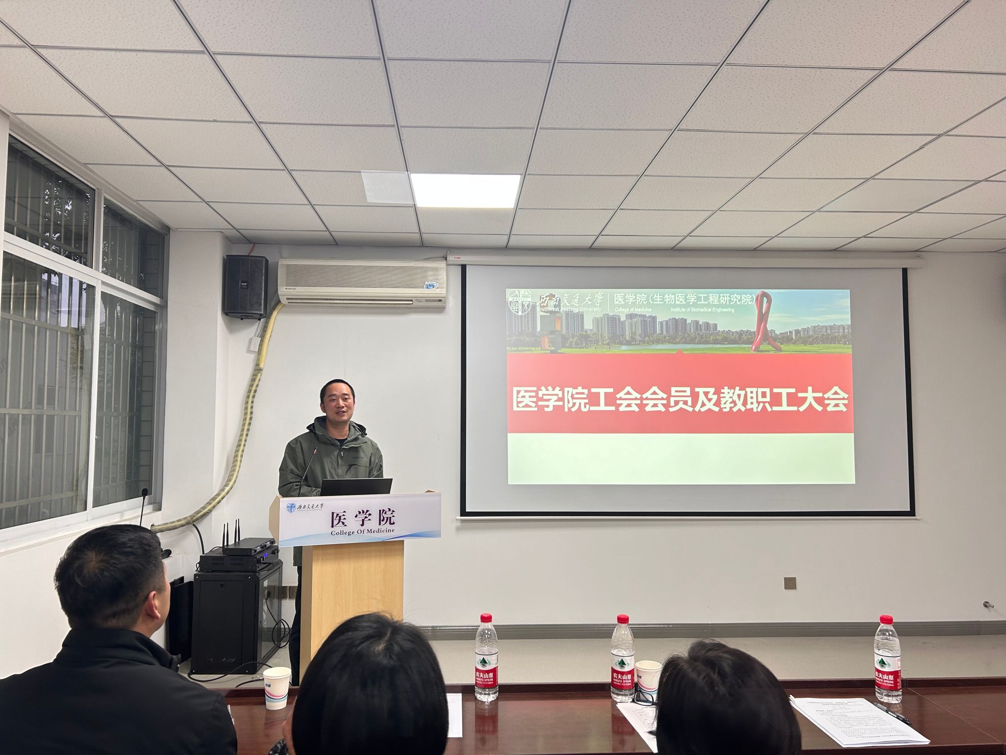 12月28日,医学院在小白楼学术报告厅召开了2023年度工会会员及教职工大会,全体在校教职工和部分学生代表参加了会议。会议由学院青工委委员胡豪主持,大会在雄壮地国歌声中拉开帷幕。
