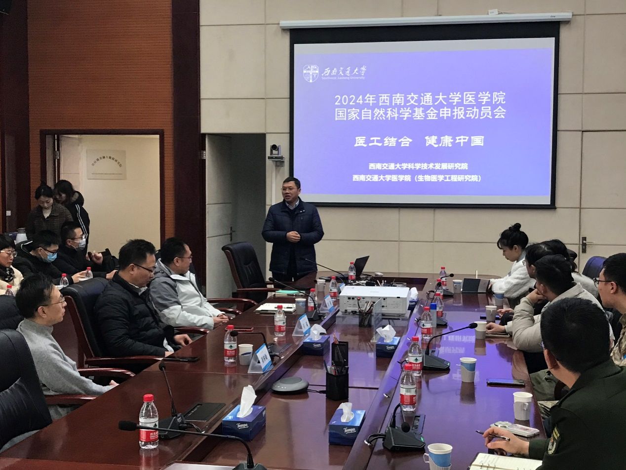 2023年12月27日下午,医学院在九里校区1号综合楼会议室召开了2024年国家自然科学基金申报动员会。医学院院长周绍兵教授、科学技术发展研究院(以下简称“科研院”)马霖副院长、化学学院副院长崔树勋教授、附属医院西部战区总医院田国部长出席了本次会议。两家附属医院(成都市第三人民医院和西部战区总医院)和医学院教师共80余人参会。本次会议由医学院周绍兵院长主持。