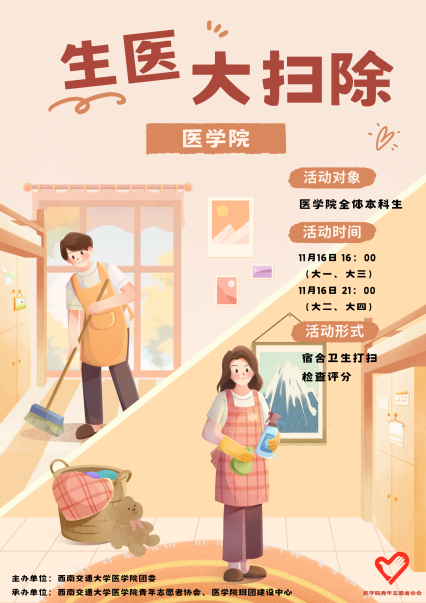 开展劳动教育是贯彻党的教育方针的重要举措,也是学生成长的必要途径,具有树德、增智、强体、育美的综合育人价值。为进一步引导广大学生树立正确劳动观念,培养积极主动的劳动态度,增强集体劳动意识,医学院开展了“生医大扫除”劳动教育实践系列活动,鼓励同学们动手实践、出力流汗,共同营造良好的校园生活环境。2023年11月16日,医学院青年志愿者协会和班团建设中心携手开展了第一期“生医大扫除”,全体医学院本科生参与。