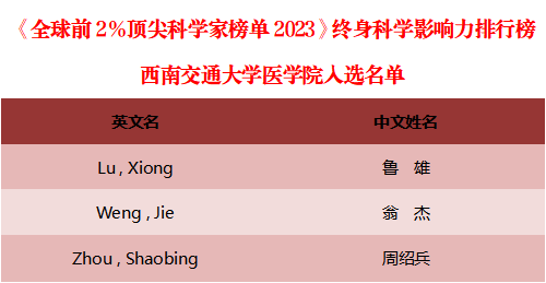 2023年10月4日,美国斯坦福大学在国际知名学术网站Research.com发布了2023年度“全球前2%顶尖科学家榜单”(World’s Top 2% Scientists 2023),西南交通大学共55位学者入选,列全国第37位,医学院共有3位教授入选本年度影响力榜单。
