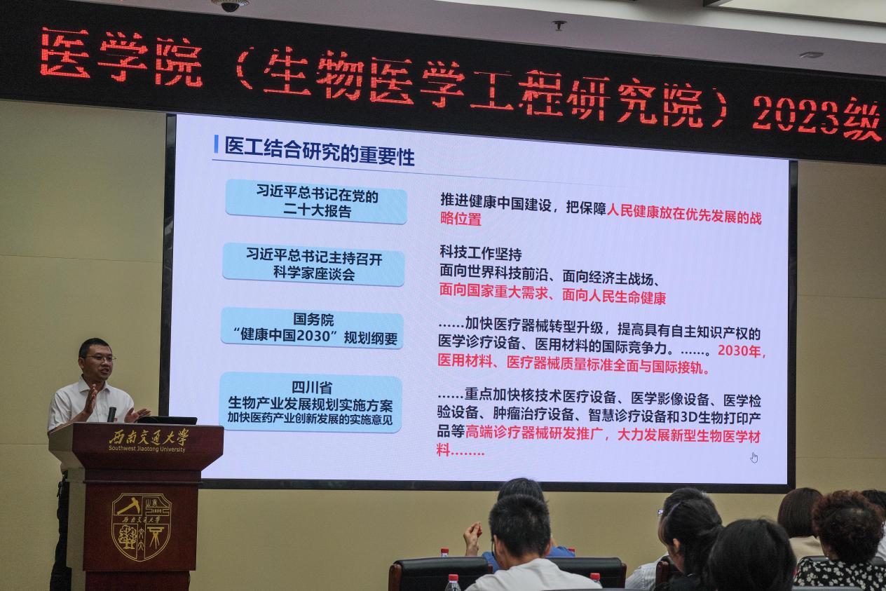 周绍兵院长首先对进入医学院的61名本科生表示了衷心的祝贺与热烈的欢迎。回望过去,立足现实,展望未来。周绍兵院长从历史背景、发展历程、师资队伍、研究特色、学科布局、发展战略等方面介绍医学院以及生物医学工程专业。他表示:医学院与生物医学工程具有广阔的前景,鼓励同学们做好学习规划,踔厉奋发,砥砺前行,不断为人类的健康事业做出贡献。