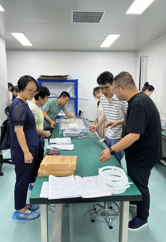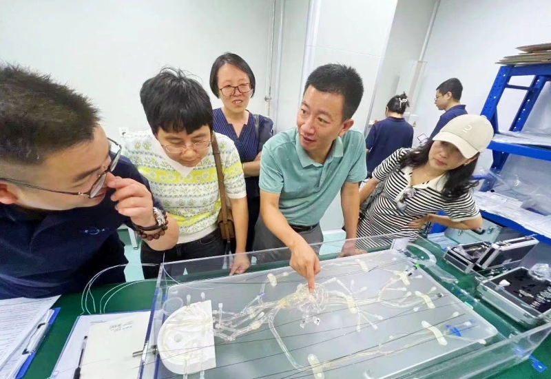 医学院一行现场参观了神经介入、外周介入等相关产品的生产车间、质量检验及产品展厅,听取了公司创始人的介绍,详细了解了医疗器械产品的市场及临床需求。
