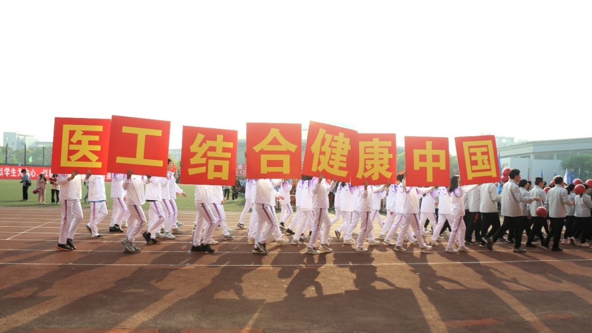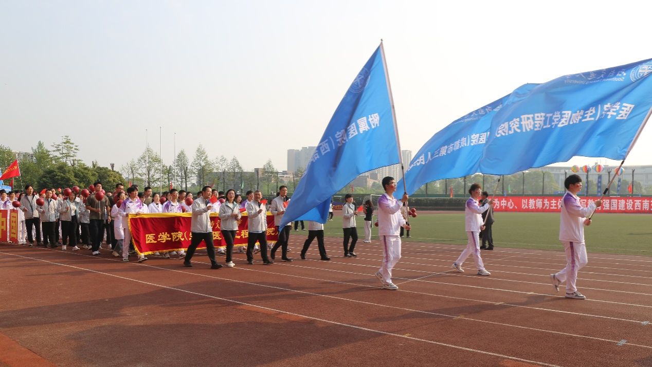 医学院和附属医院方针,高举三面旗帜、迈着坚定整齐的步伐步入赛场,“临床生医,开拓创新,医工结合,健康中国”,铿锵的口号在回响在整个赛场。方阵走在红色的跑道上,更是走在建设具有医工结合特色医学院的道路上,医学院和附属医院全体师生团结奋斗、攻坚克难,充分聚合成都市第三人民医院和西部战区总医院及学校的特色与优势,致力医学科技创新,他们正在为建设医工结合特色鲜明的研究型医学院、为党的卫生健康事业勇毅前行。