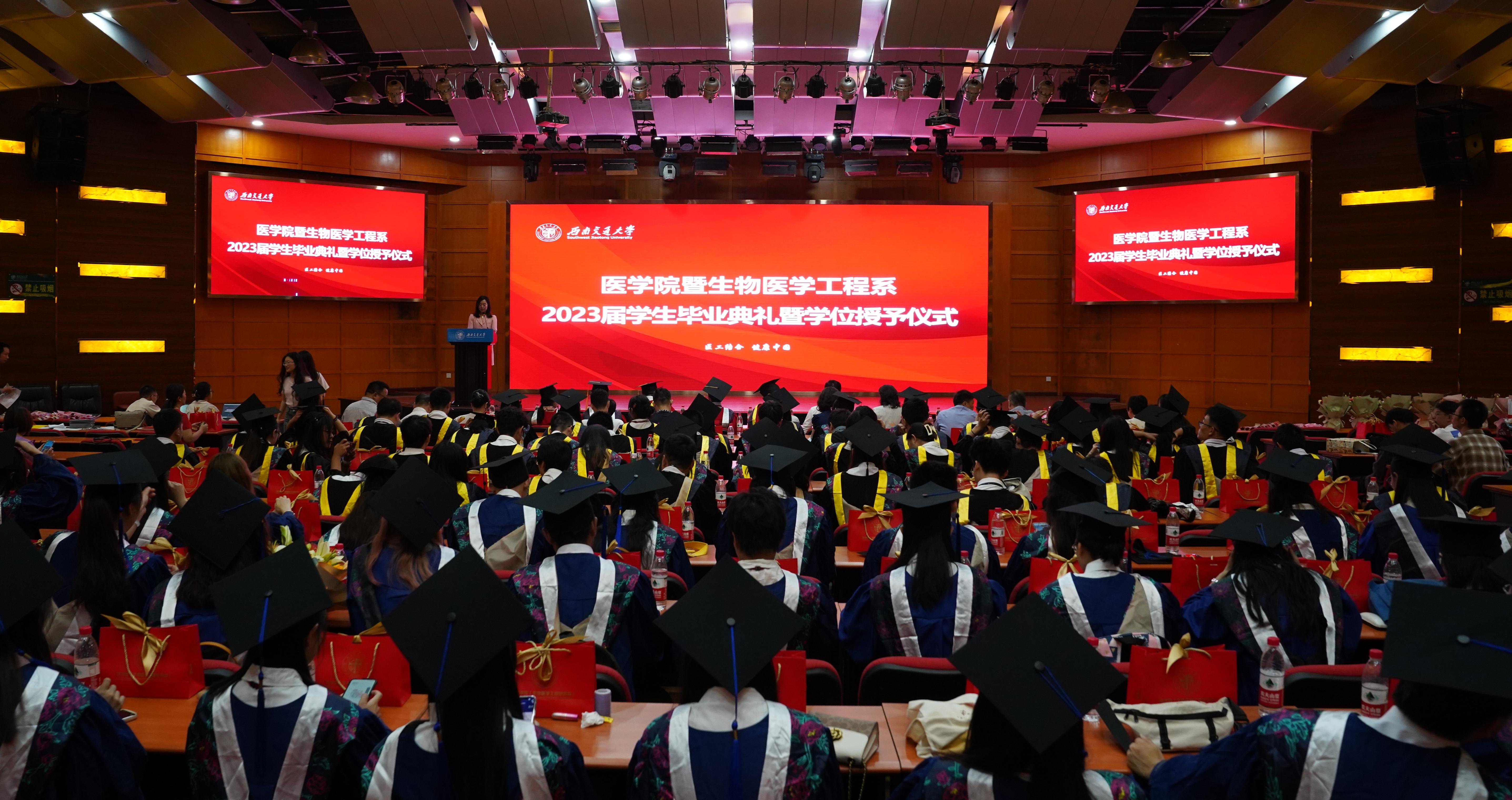 6月17日上午10时,医学院暨生物医学工程系2023届学生毕业典礼暨学位授予仪式在九里校区国际会议厅隆重举行。医学院院长周绍兵、党委书记李锦红、附属医院成都市第三人民医院党委书记徐俊波、医学院副院长冷永祥、副院长李暄,生物医学工程系、附属医院第三人民医院和西部战区总医院的近30名导师、医学院机关各办公室老师以及毕业生亲友出席典礼。医学院党委副书记于楠主持典礼。