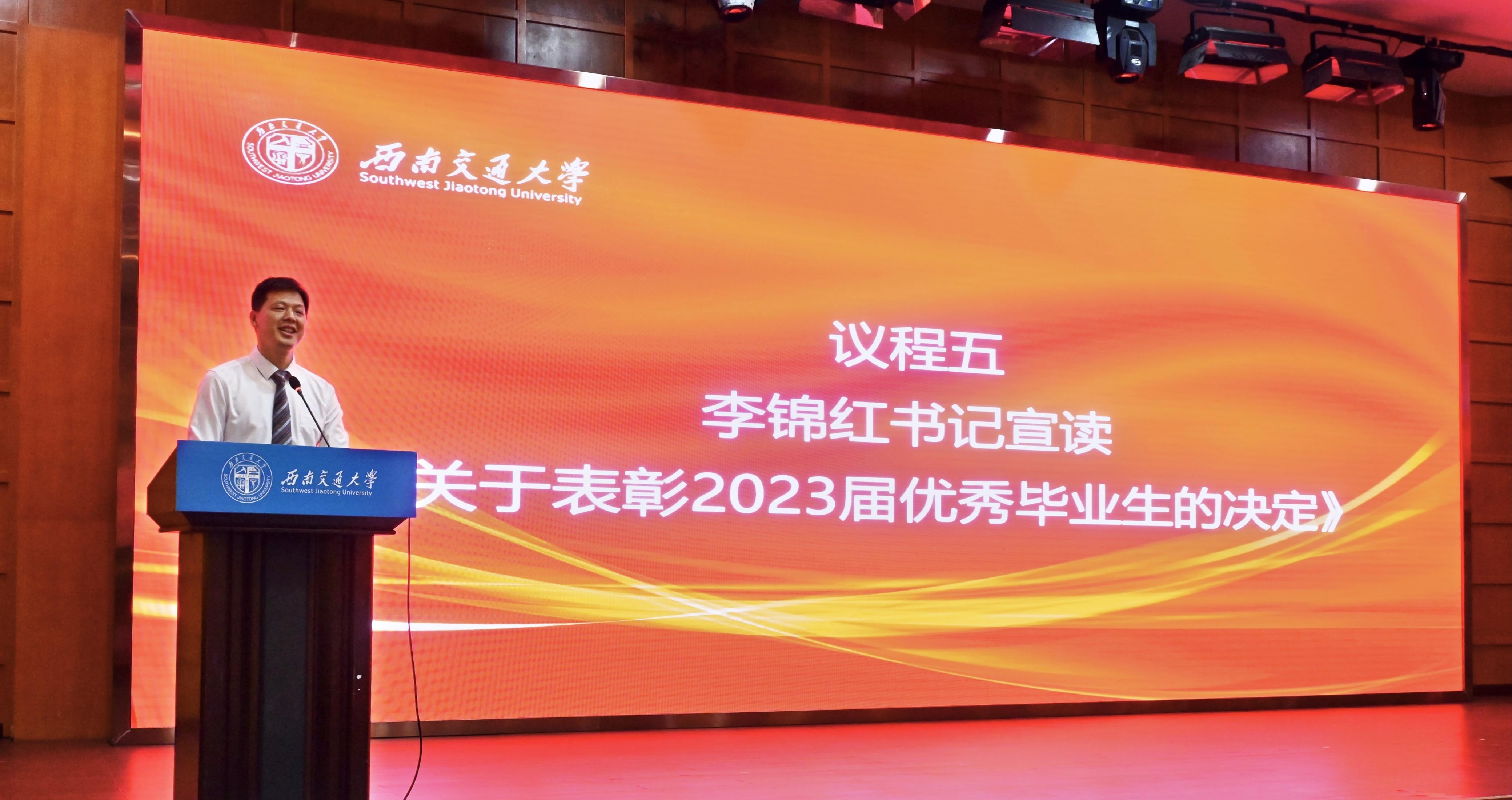 学院党委书记李锦红宣读了《关于表彰2023届省级、校级优秀毕业生的决定》。经校长办公会审定,四川省教育厅批准,决定授予医学院李杨、周孟雪2名本科生,梁琦、武楷文、赵治戎3名研究生,“四川省优秀大学毕业生”荣誉称号。经校长办公会审定,决定授予医学院侯丁煜、梁月、于昕冉、赵一心、姚烨兰5名本科生,罗强、刘瑶、鲁欣、杨雪、喻谦、张婕鑫、张雪7名研究生“西南交通大学优秀毕业生”荣誉称号。李锦红书记向获表彰的毕业生及全体毕业生致以祝贺,希望广大毕业生坚定理想信念,继续秉承和发扬“竢实扬华,自强不息”的交大精神,脚踏实地、埋头苦干,肩负当代大学生的使命担当,续写新时代青年的奋斗征程。随后,周绍兵院长与李锦红书记共同为获得省级、校级优秀毕业生的同学们颁发了证书。