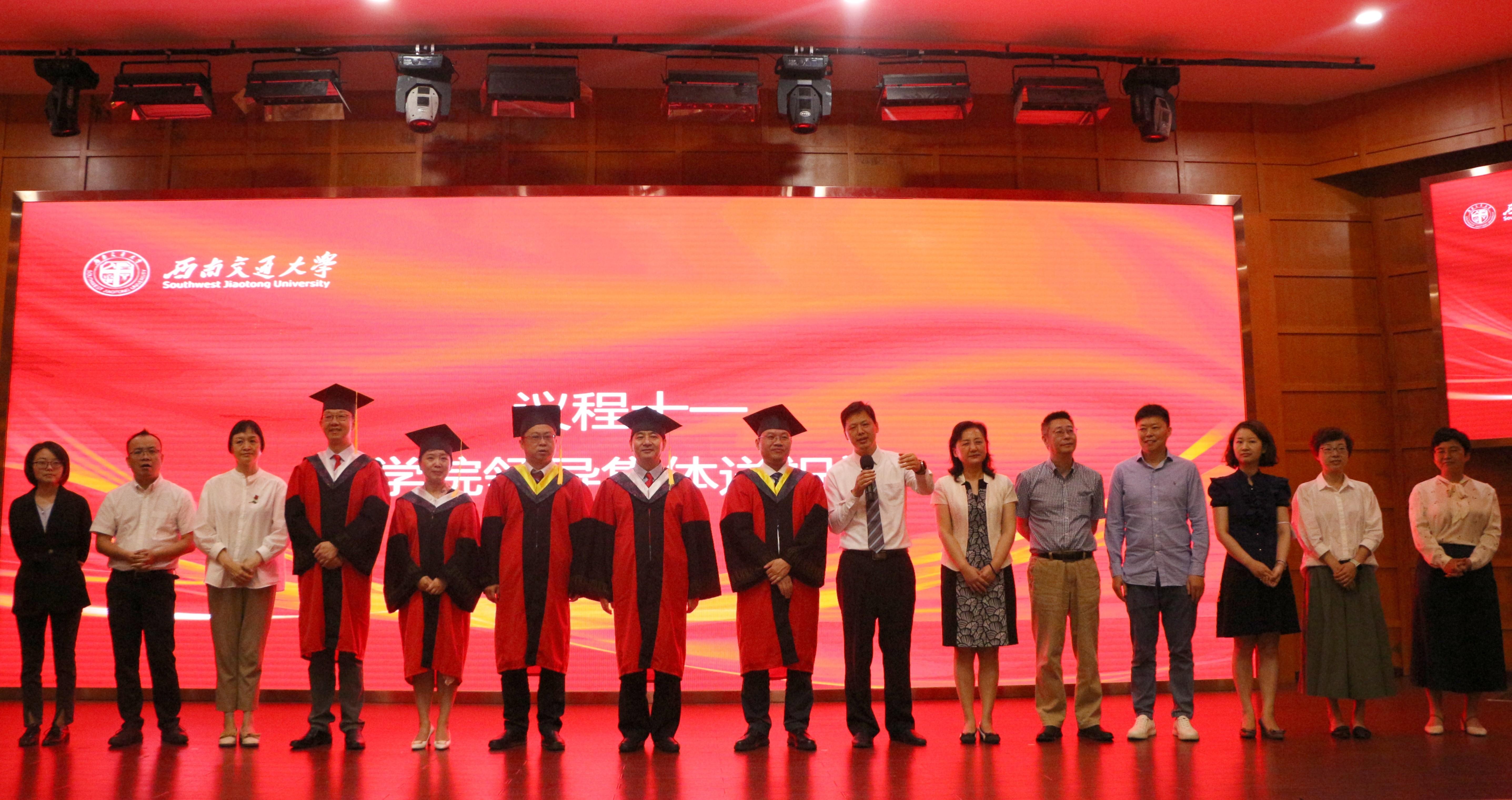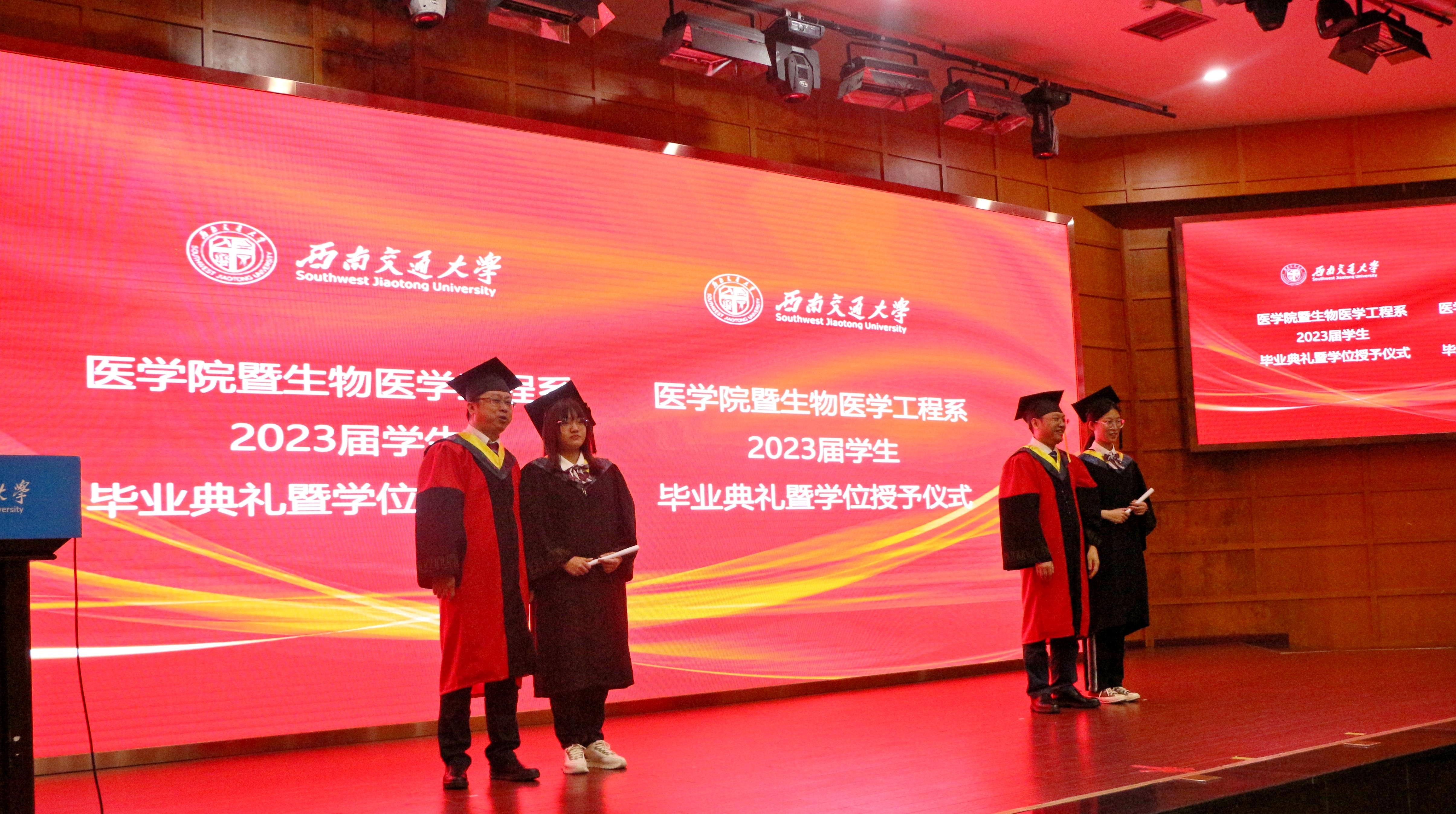 在雄壮的国歌声中,典礼拉开帷幕。典礼上,医学院副院长冷永祥宣读了《西南交通大学医学院2023年6月学士、硕士学位授予决定》。经西南交通大学学位评定委员会第21次会议审议通过,决定授予医学院2023届学生学士学位54人、硕士学位52人。随后,医学院院长周绍兵、副院长冷永祥为医学院获工学学位的2023届毕业生授位,成都市第三人民医院导师徐俊波、西部战区总医院导师戴睿武为医学院获医学学位的2023届毕业生授位,并合影留念。当流苏被拨动,广大毕业生开启了新的人生征程。