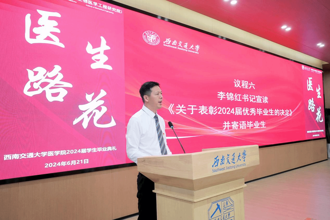 在授位仪式结束后,李锦红书记宣读了《关于表彰2024届优秀毕业生的决定》,决定授予2名本科生和2名研究生2024届“四川省优秀大学毕业生”、5名本科生和6名研究生2024届“西南交通大学优秀毕业生”荣誉称号。这些优秀毕业生在学业、科研、社会实践等方面都取得了卓越的成绩,他们的事迹激励着在场的每一位同学。李书记指出,“希望这些毕业生们在今后的人生道路上,将自身所学更好地融入中国式现代化的建设当中,既要仰望星空、也要脚踏实地,为引领医学科技创新,建设健康幸福中国做出更大的贡献。”同时,号召学院全体在校学生向优秀毕业生学习,为建设具有医工结合特色的研究型医学院,为建设交通特色鲜明的世界一流大学贡献力量!随后,周绍兵院长、李锦红书记为优秀毕业生代表颁奖。