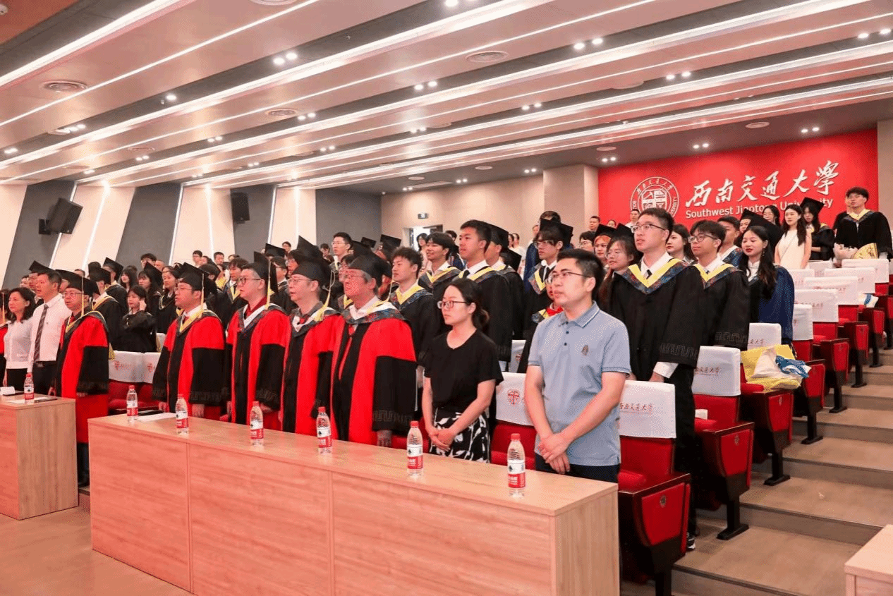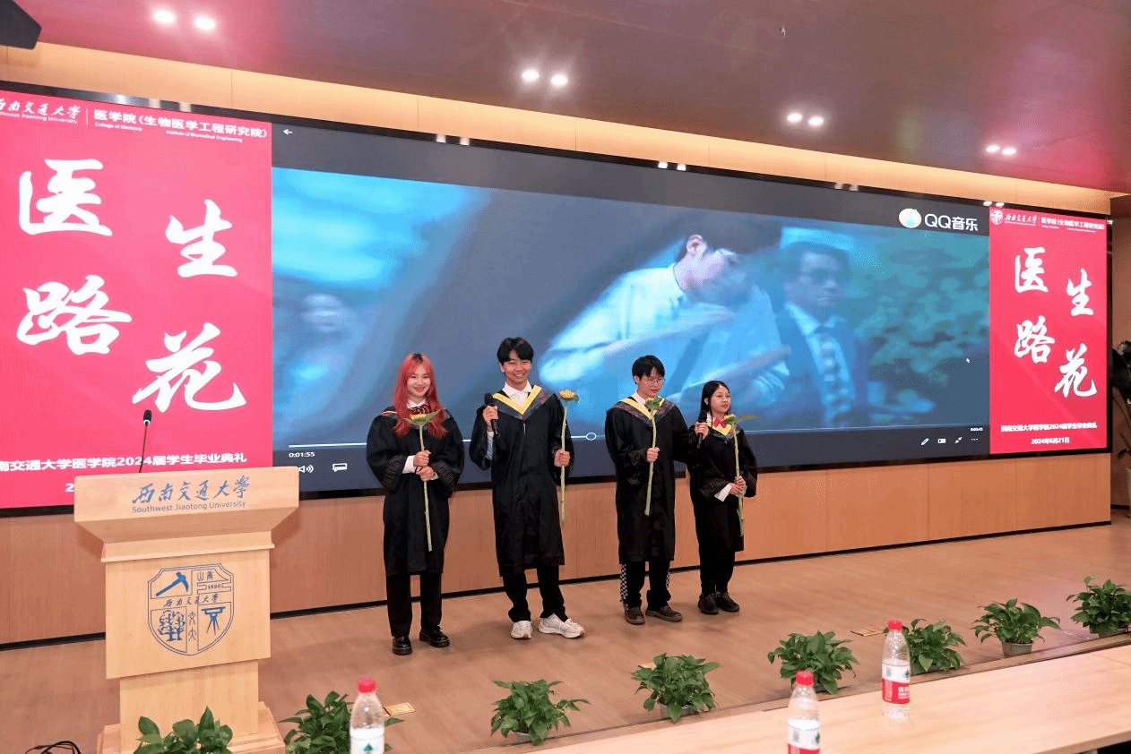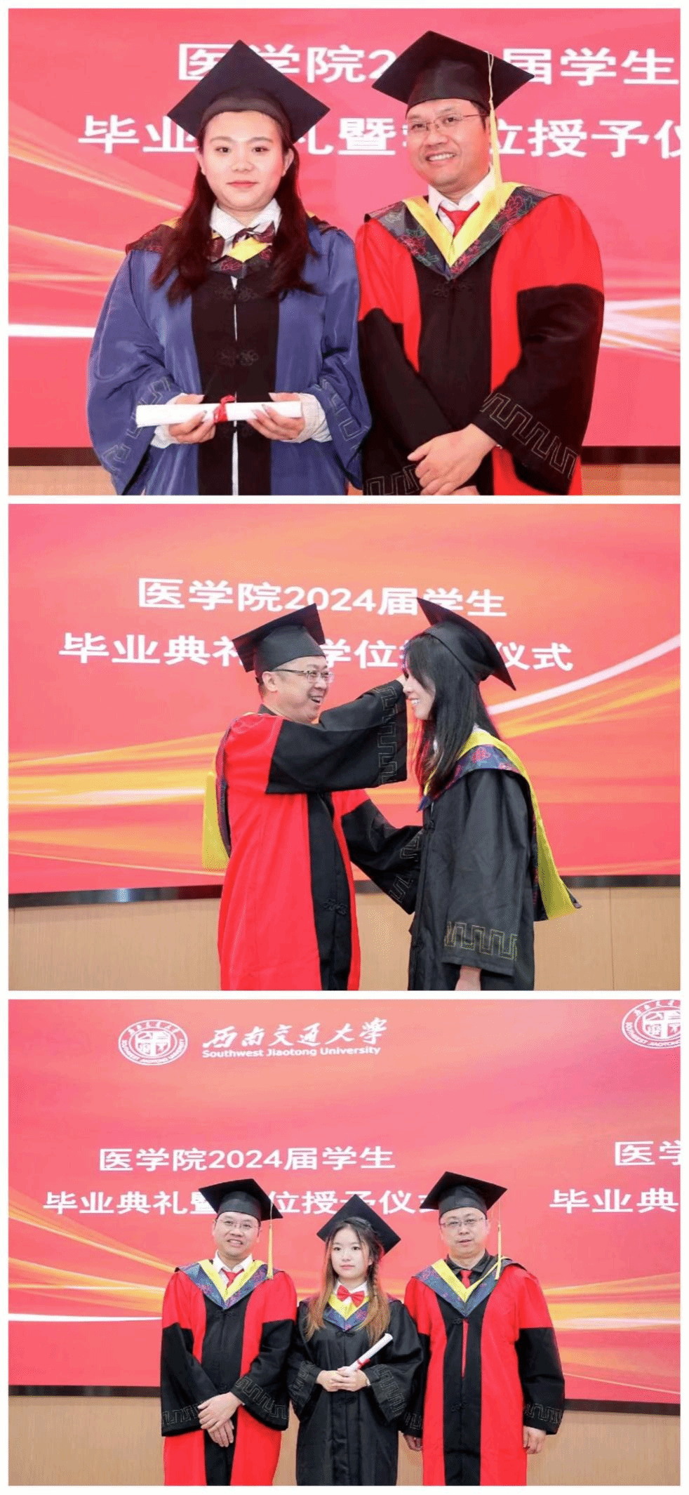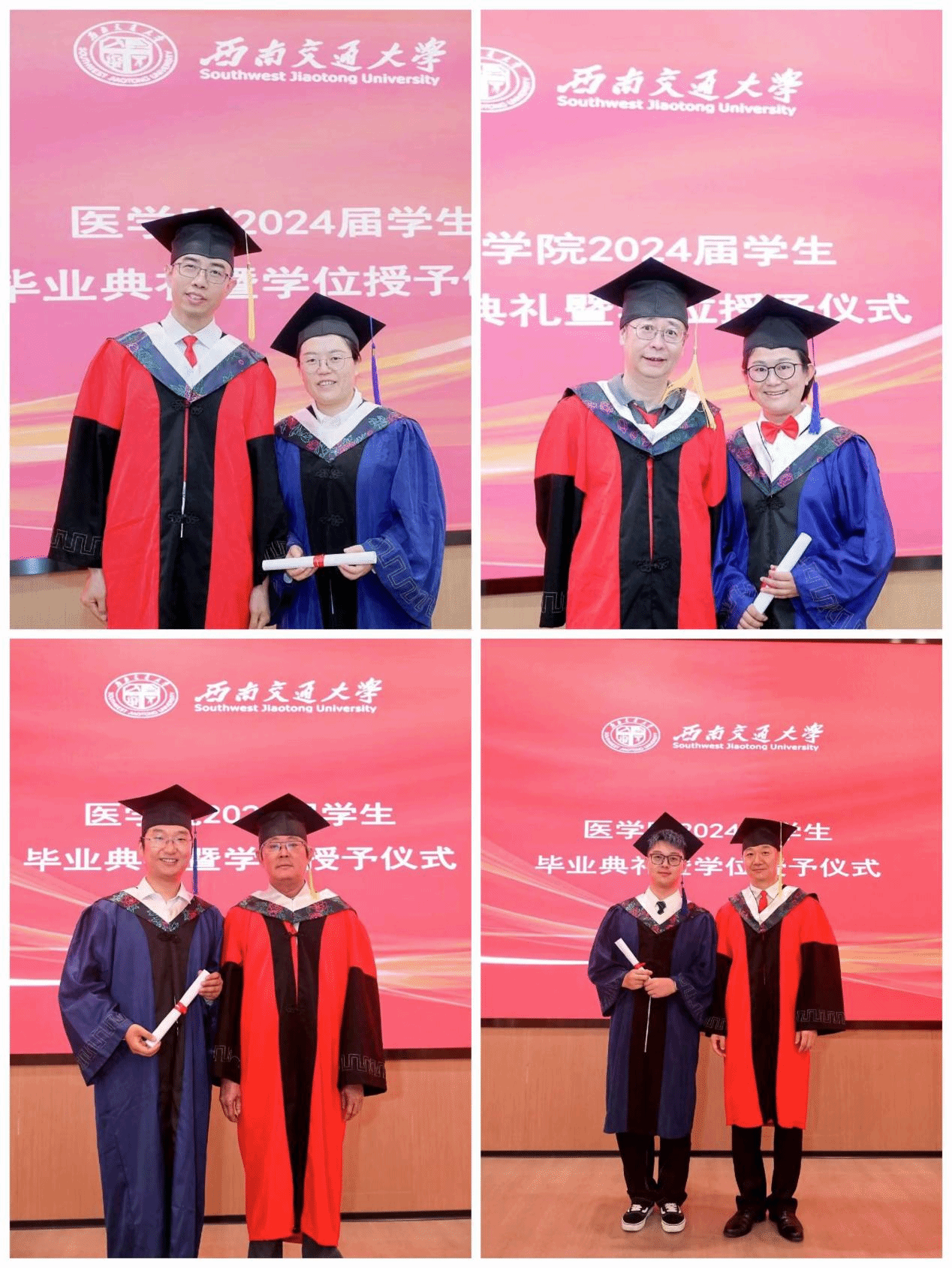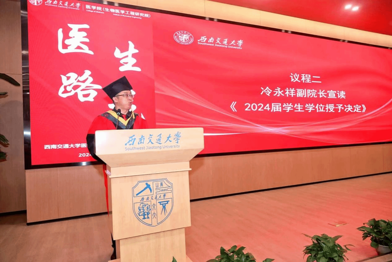 “经西南交通大学学位评定委员会审议通过,决定授予医学院2024届学生学士学位44人、硕士学位54人。”活动议程第二项,由冷永祥副院长宣读《西南交通大学医学院2024年6月学士、硕士学位授予决定》。随后,周绍兵院长、冷永祥副院长走上台前,亲自为生物医学工程(工学)2024届毕业生授位。他们庄重地将学位证书交到每一位毕业生手中,这不仅是对他们学业成绩的认可,更是对他们未来人生的美好祝愿。紧接着,医院导师周龙甫、王文春、孙晓滨、项涛也分别为生物医学工程(医学)、临床医学毕业生授位。
