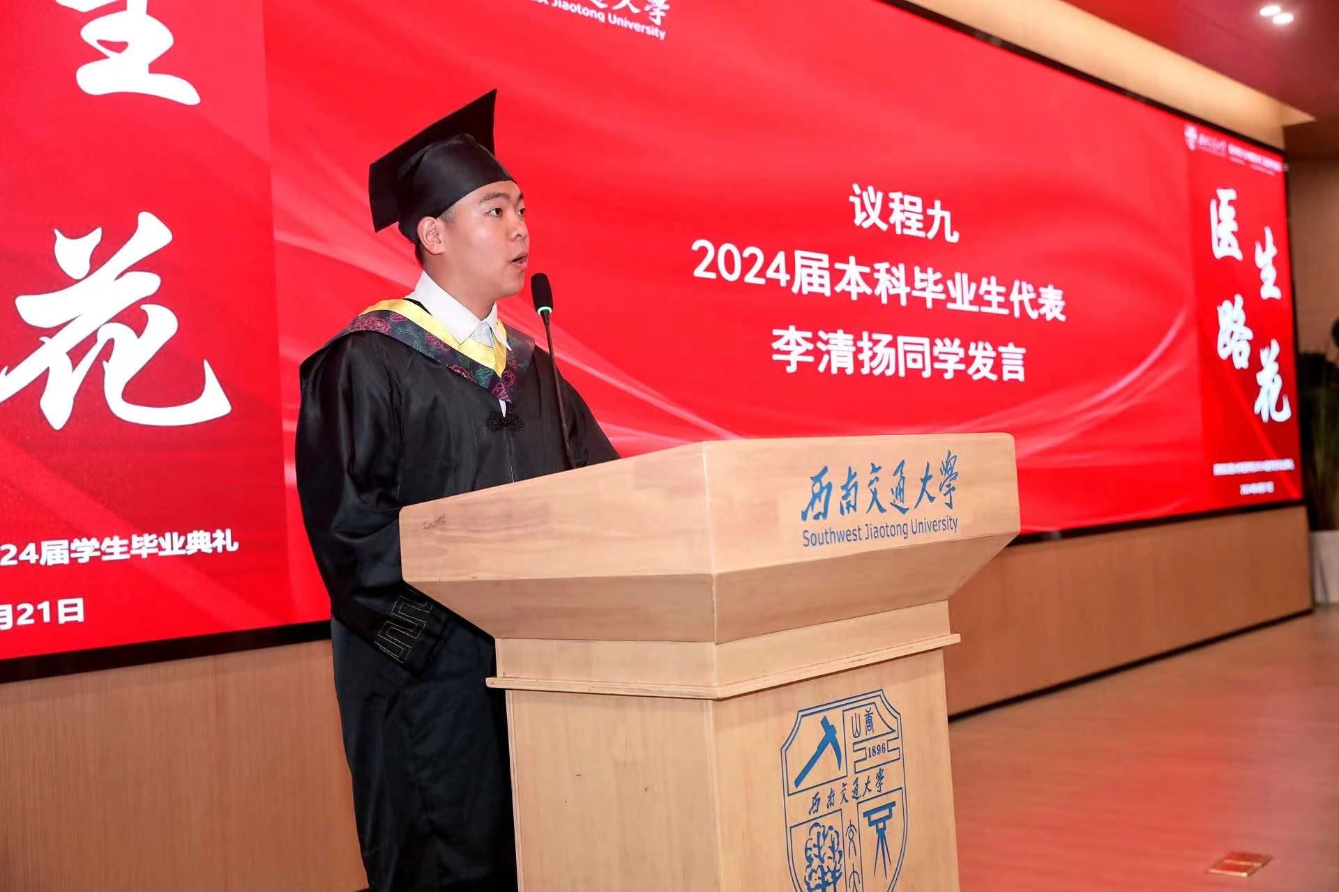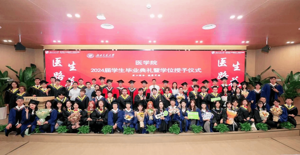 繁花似锦的校园,承载着青春的记忆,六月的微风轻拂着校园,带来了一年一度的毕业季。6月21日上午10时30分,医学院2024届学生毕业典礼暨授位仪式在犀浦校区图书馆1号报告厅隆重举行。本次典礼由学院党委副书记于楠主持,医学院院长周绍兵、党委书记李锦红、副院长冷永祥、副院长李暄等领导以及众多导师、全体辅导员出席,与全体毕业生共同见证了这一重要时刻。