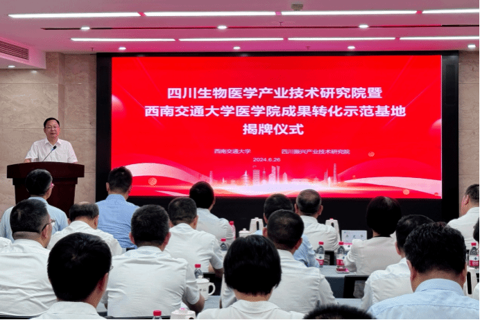 赵其春在揭牌仪式上发表重要讲话,强调生物医药是四川振兴产研院未来产业培育的关键重点与发展方向。此次四川振兴产研院与西南交通大学携手共建四川生物医学产业技术研究院(西南交通大学医学院成果转化示范基地),将聚焦于功能与特医食品、医药中间体、生物医学材料、医工交叉产品、医疗高端设备和脑机接口等领域,致力于构建生物医学工程创新链、产业链、资本链“三链协同”的高能级产业孵化平台。未来,双方将充分借助四川生物医学产业技术研究院(西南交通大学医学院成果转化示范基地)的强大平台优势,以科技成果转化应用为核心,共同探索科技成果从实验室迈向生产线的“研究院经济”模式,大力提升科技成果转化效率,孵化实体产业,培育众多“硬科技”企业,为推动四川乃至全国生物医药产业的繁荣发展贡献更多的智慧与力量。