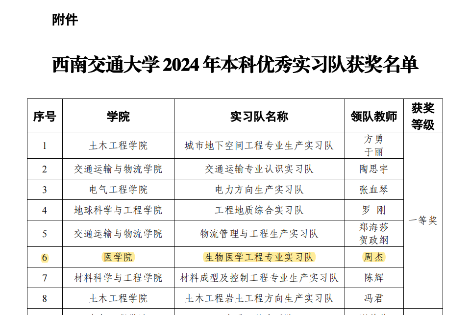 实习是人才培养的重要组成部分,是深化课堂教学的重要环节。为落实《教育部关于加强和规范普通本科高校实习管理工作的意见》(教高函〔2019〕12 号)文件精神学院重视实习实践教学,西南交通大学为表彰先进、树立典型,根据《西南交通大学本科生实习管理办法》,学校启动了 2024 年本科优秀实习队评选工作。我院周杰、常向荣和向韬老师带队的“生物医学工程专业实习队”在本次学校优秀实习队评选活动中荣获一等奖。