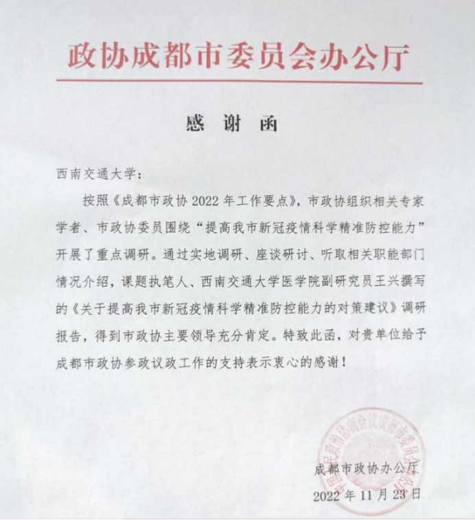 感谢函表示,按照《成都市政协2022年工作要点》,市政协组织相关专家学者、市政协委员围绕“提高我市新冠疫情科学精准防控能力”开展了重点调研。通过实地调研、座谈研讨、听取相关职能部门情况介绍,课题执笔人、西南交通大学医学院副研究员王兴在此基础上撰写了《关于提高我市新冠疫情科学精准防控能力的对策建议》调研报告,得到市政协主要领导充分肯定,为此对王兴同志表示衷心的感谢!