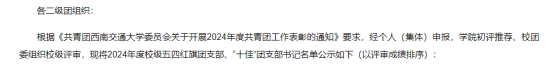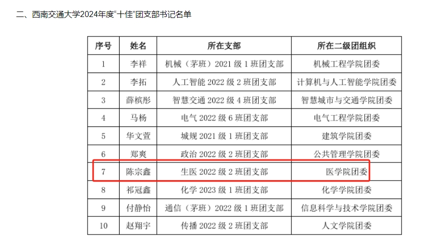 根据《共青团西南交通大学委员会关于开展2024年度共青团工作表彰的通知》的具体要求,医学院团委积极开展评选推优工作。我院本科2022级学生陈宗鑫在本次“十佳”团支部书记评审中脱颖而出,成为学院首位获得此次殊荣的学生!