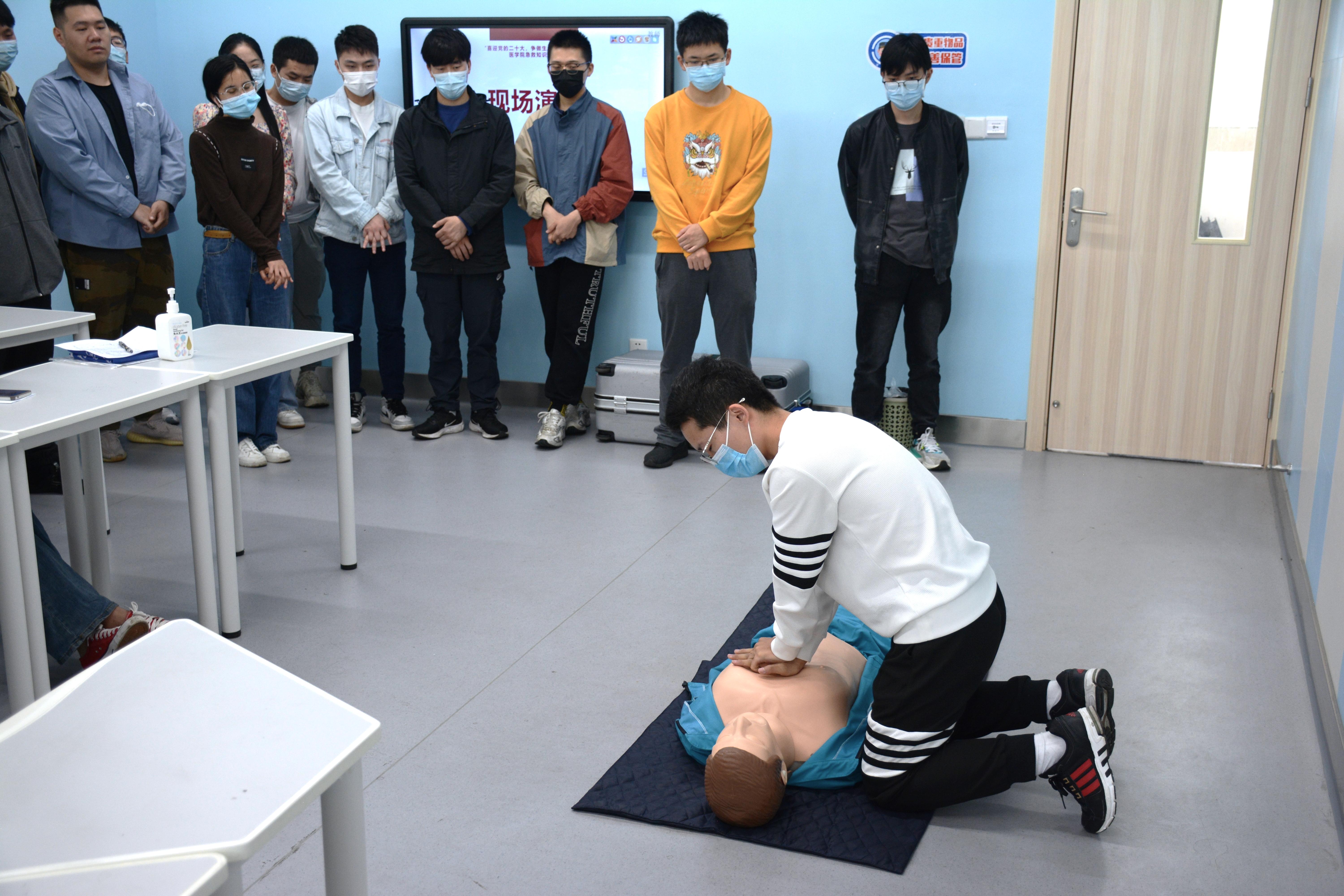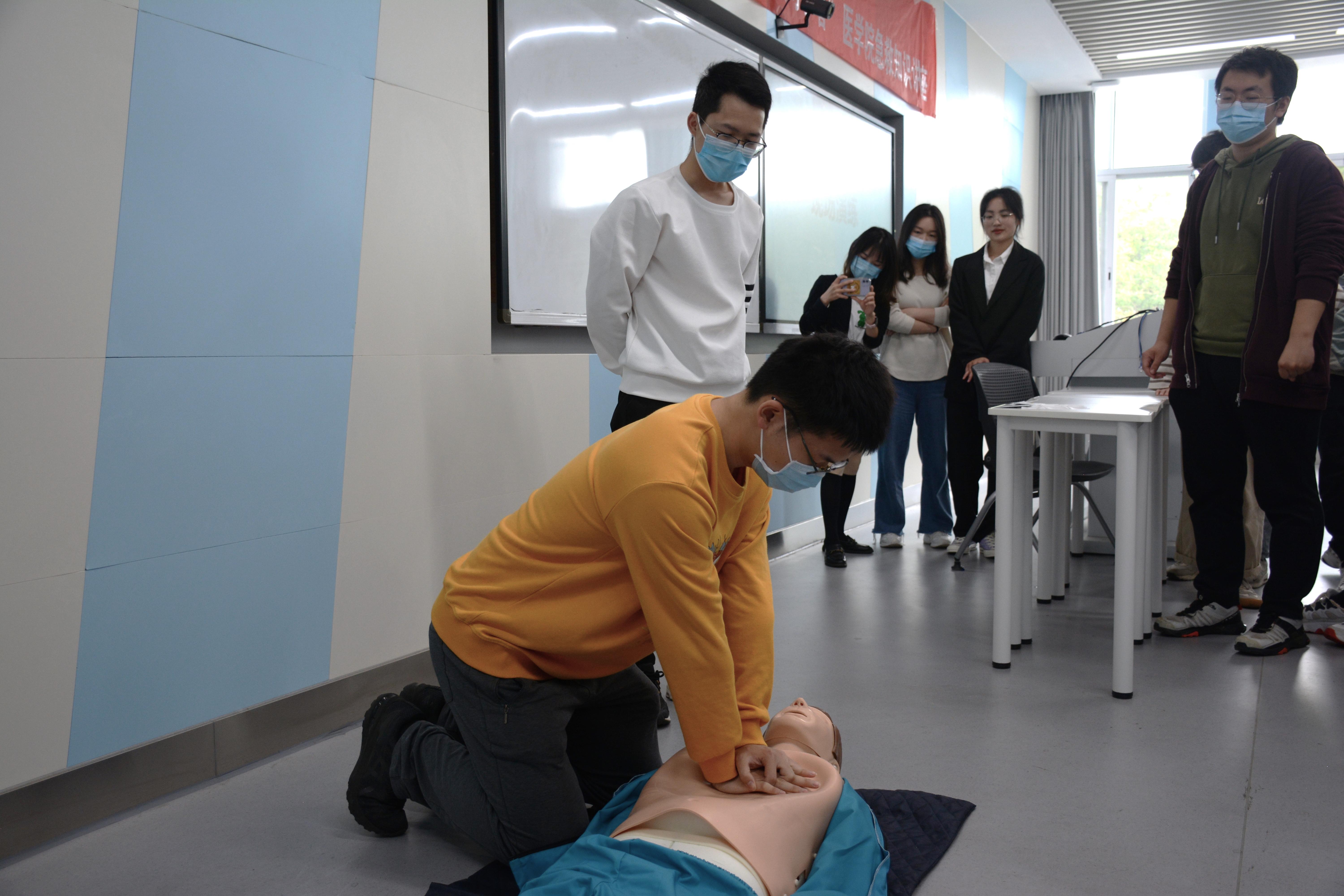 理论学习后进入现场演练环节,刘晓翰同学利用医用假人进行心肺复苏模拟示范。在示范的过程中,刘晓翰同学不仅展示了其专业、熟练的心肺复苏技能,还就心肺复苏实际操作中容易出现的问题和注意事项进行逐一讲解。