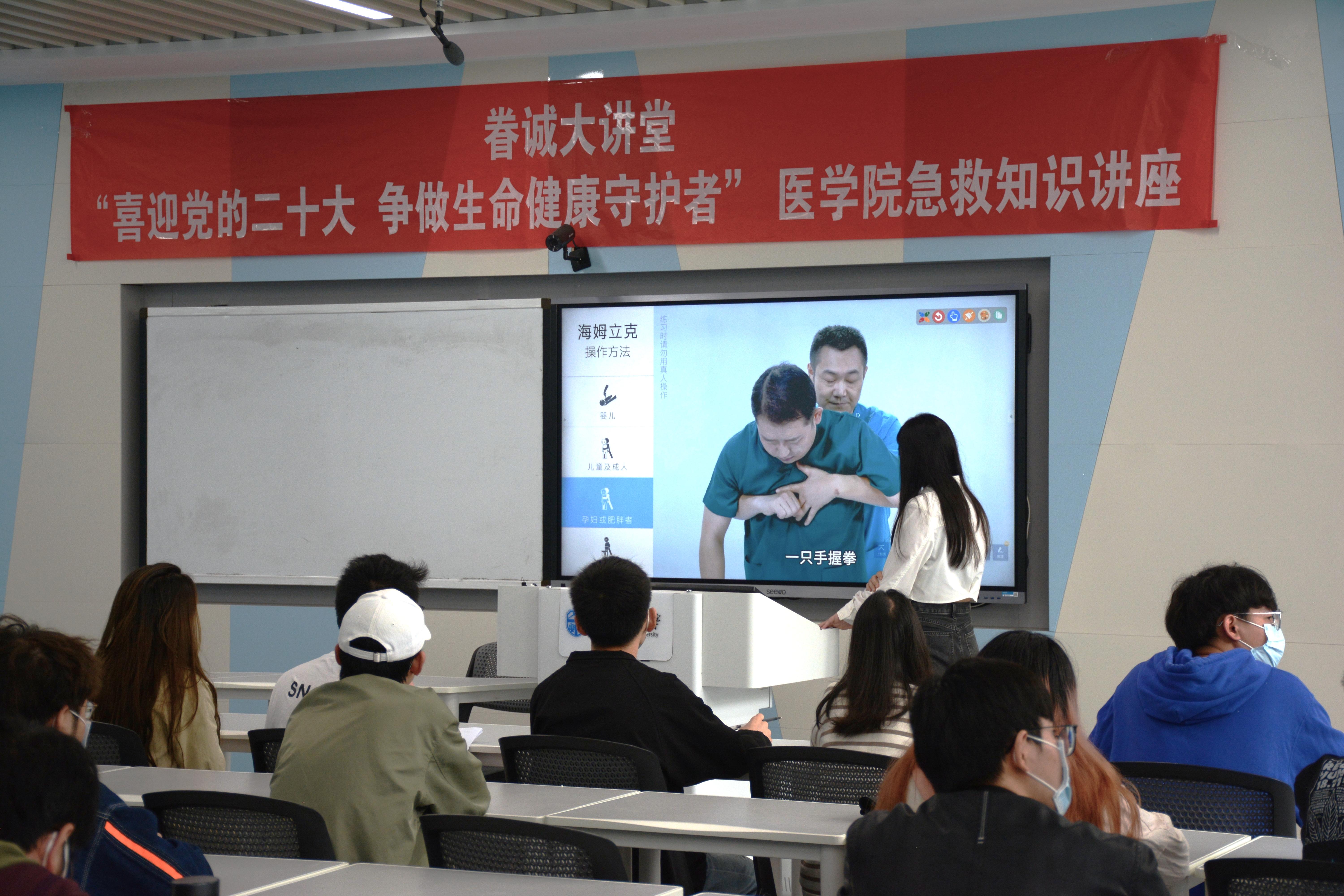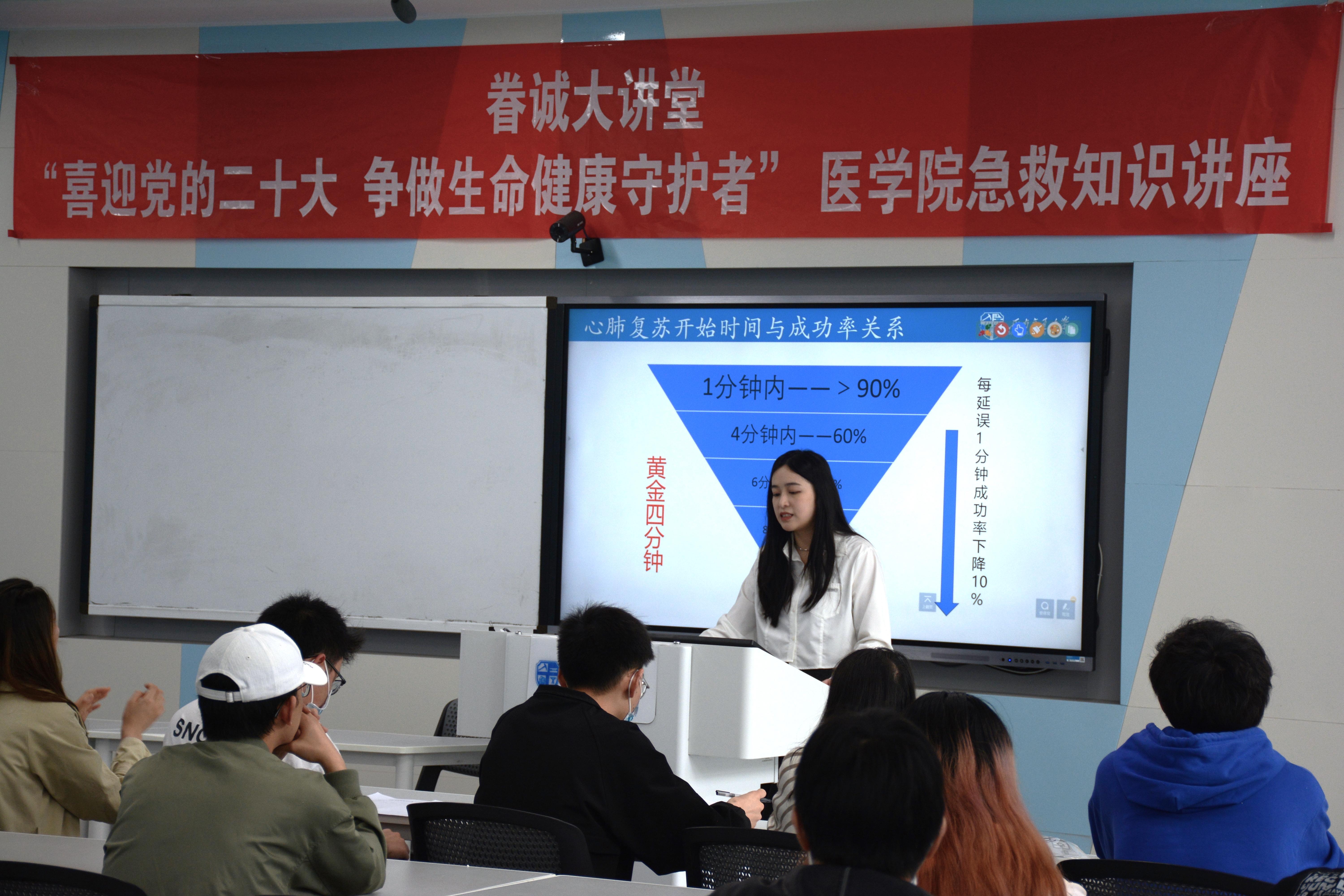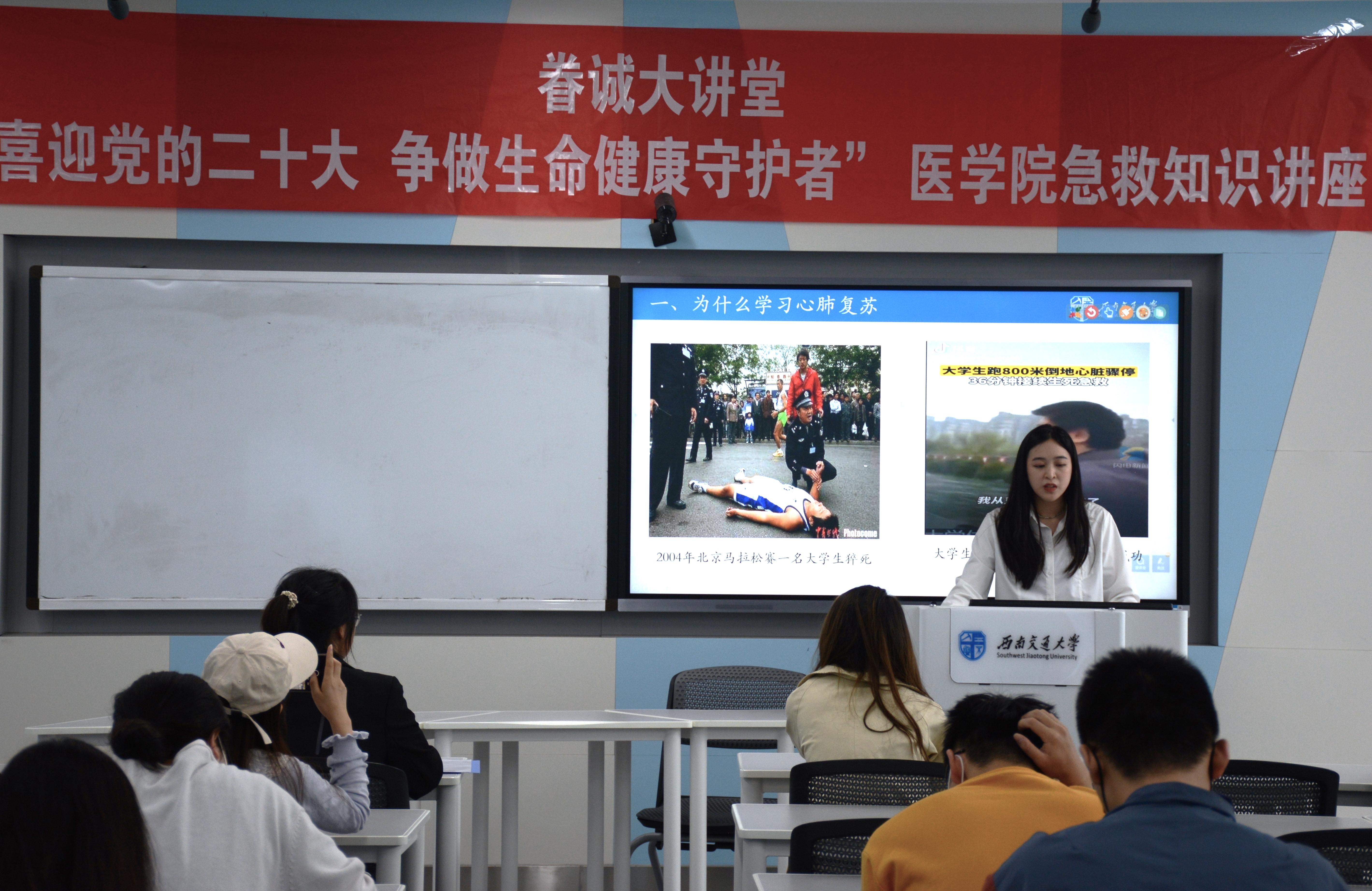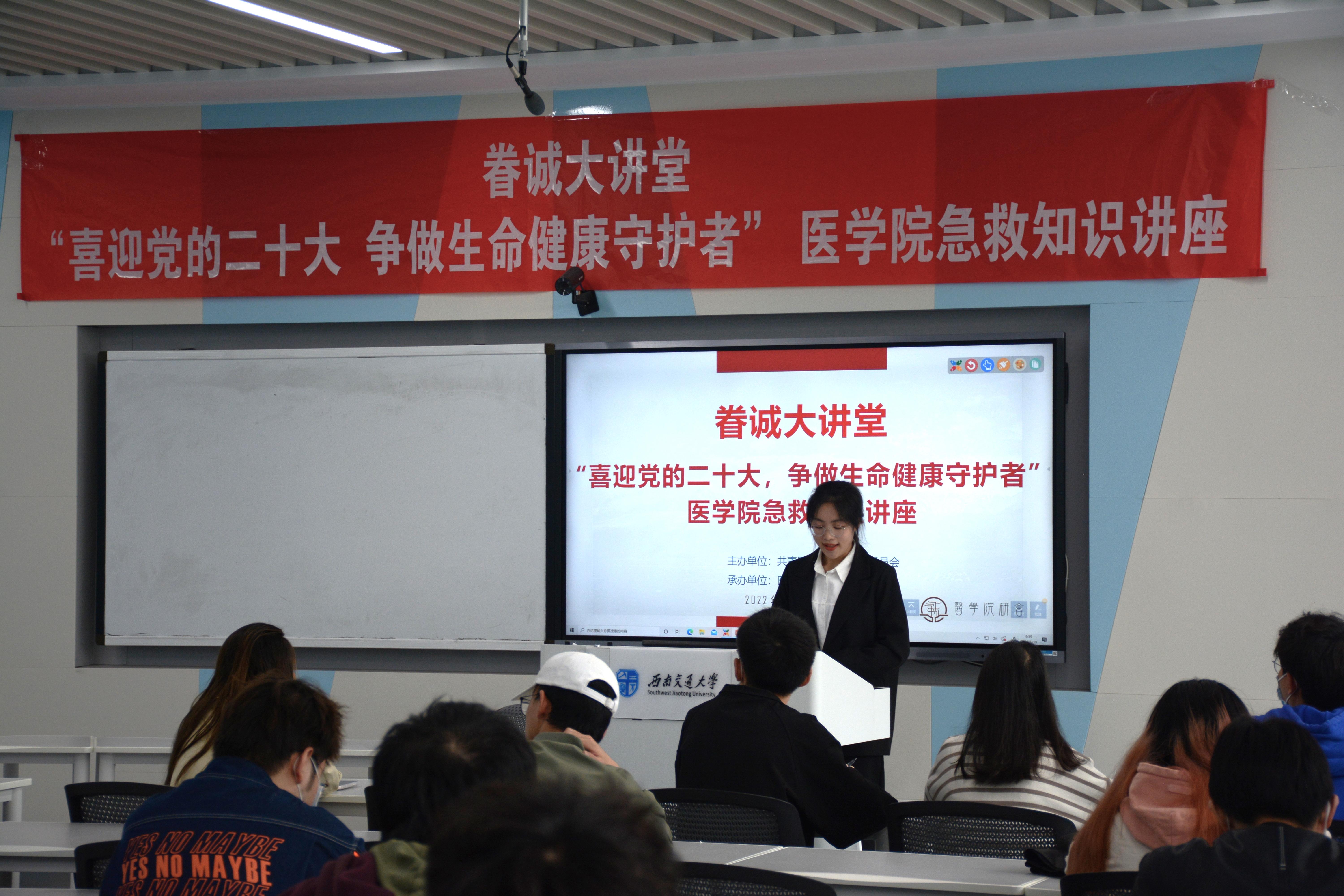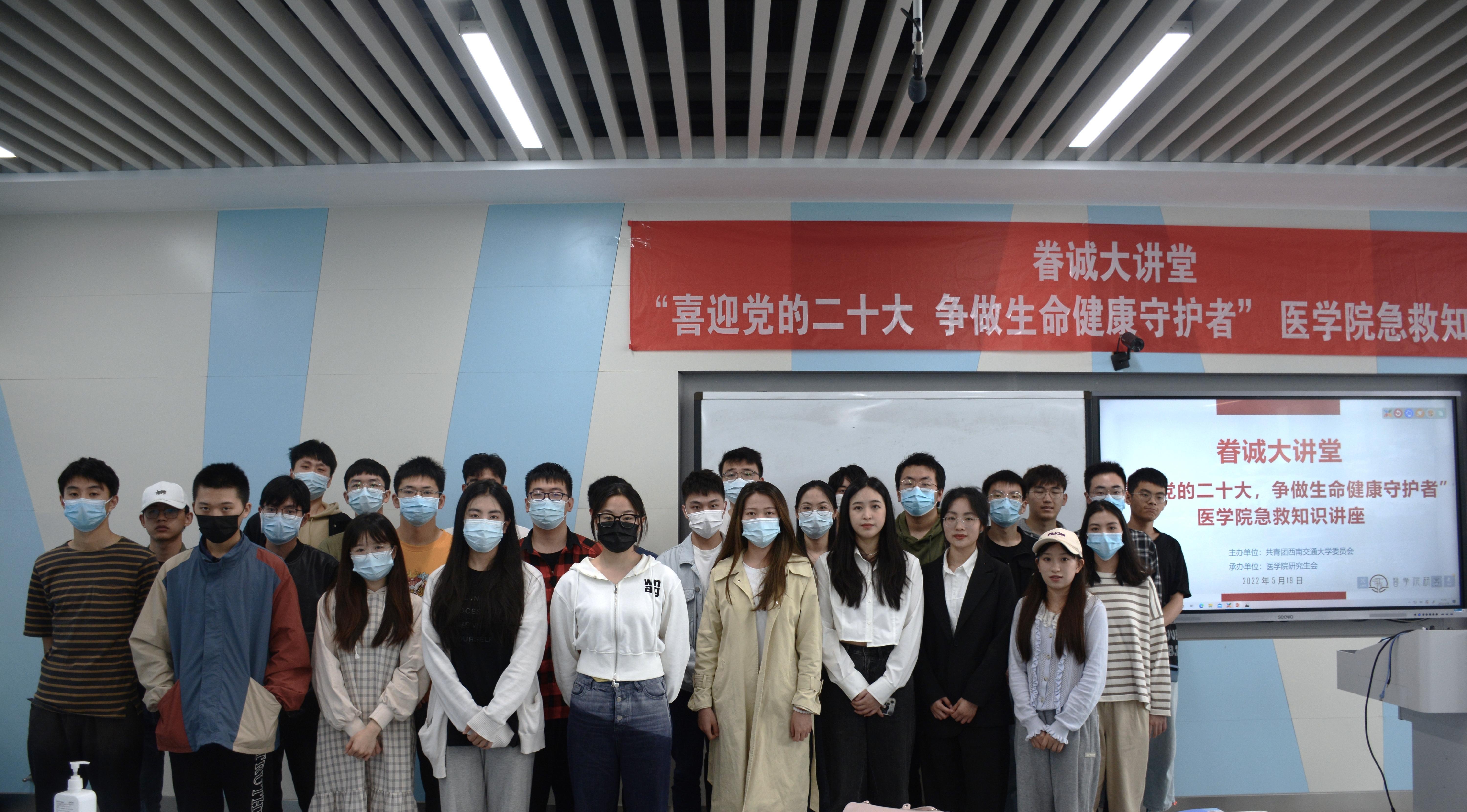 党的十九大报告指出,“人民健康是民族昌盛和国家富强的重要标志”。 这体现了党对人民健康的高度重视。为迎接党的二十大胜利召开,全面贯彻落实健康中国行动2022年工作要点,开展“关爱生命,救在身边”行动,切实保障人民群众生命安全和身体健康,加强应急救护知识技能普及培训,弘扬“人人学急救、急救为人人”的社会文明风尚,由共青团西南交通大学委员会主办,西南交通大学医学院研究生会承办,西南交通大学眷诚大讲堂—“喜迎党的二十大,争做生命健康守护者”医学院急救知识讲座于2022年5月19日上午10点在J4204召开。