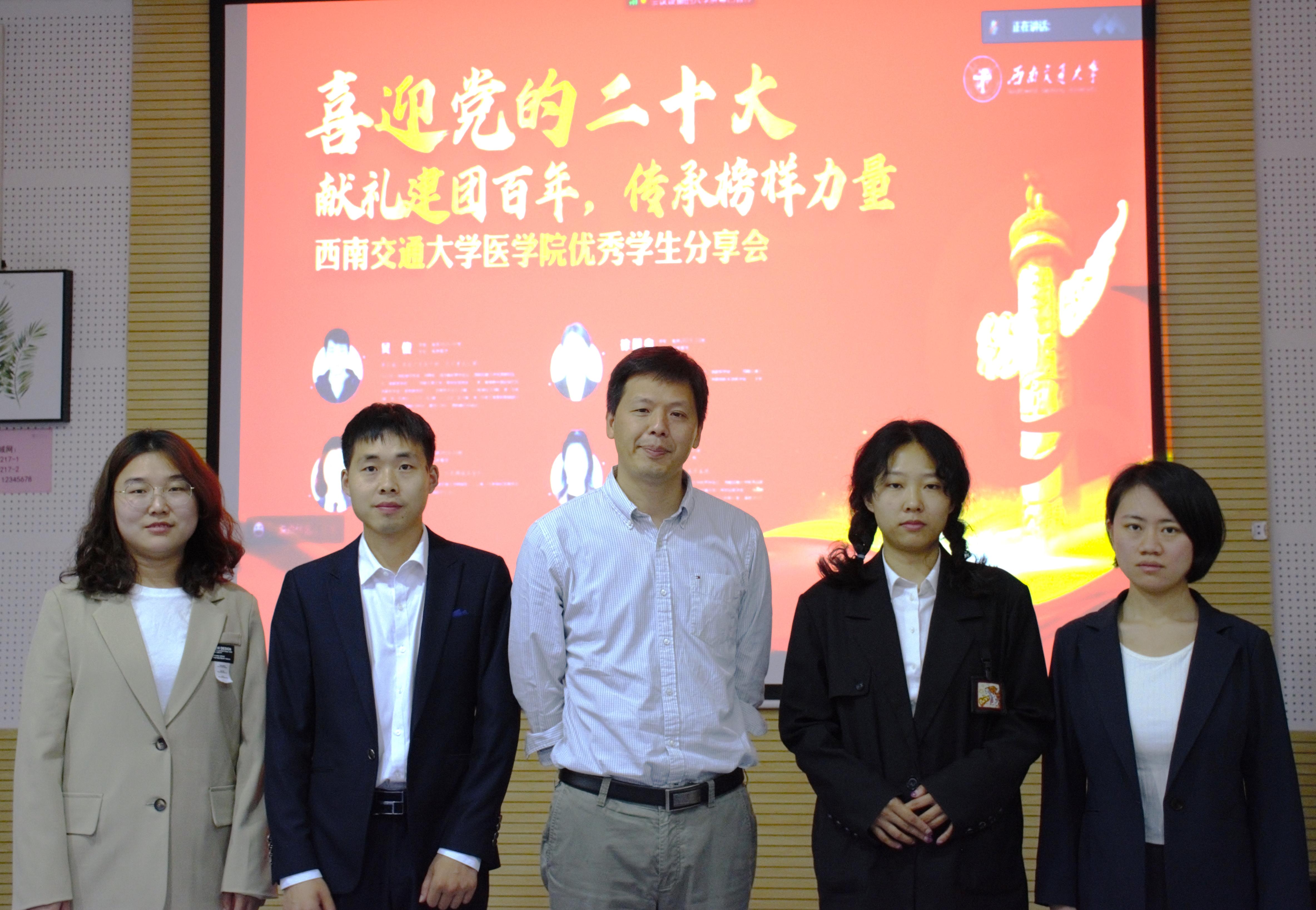 值此喜迎党的二十大,献礼建团一百年之际,为传承榜样力量,激发同学们的学习动力,满足同学们科研学习实际需要,2022年4月29号14:30西南交通大学医学院于九里校区2221报告厅举办优秀学生分享会。医学院党委书记李锦红出席本次会议,全体2021级同学及研究生会代表成员参与会议,同时,成都市第三人民医院、西部战区总医院领导与导师通过在线视频参与会议。会议由医学院辅导员黄雪梅主持。