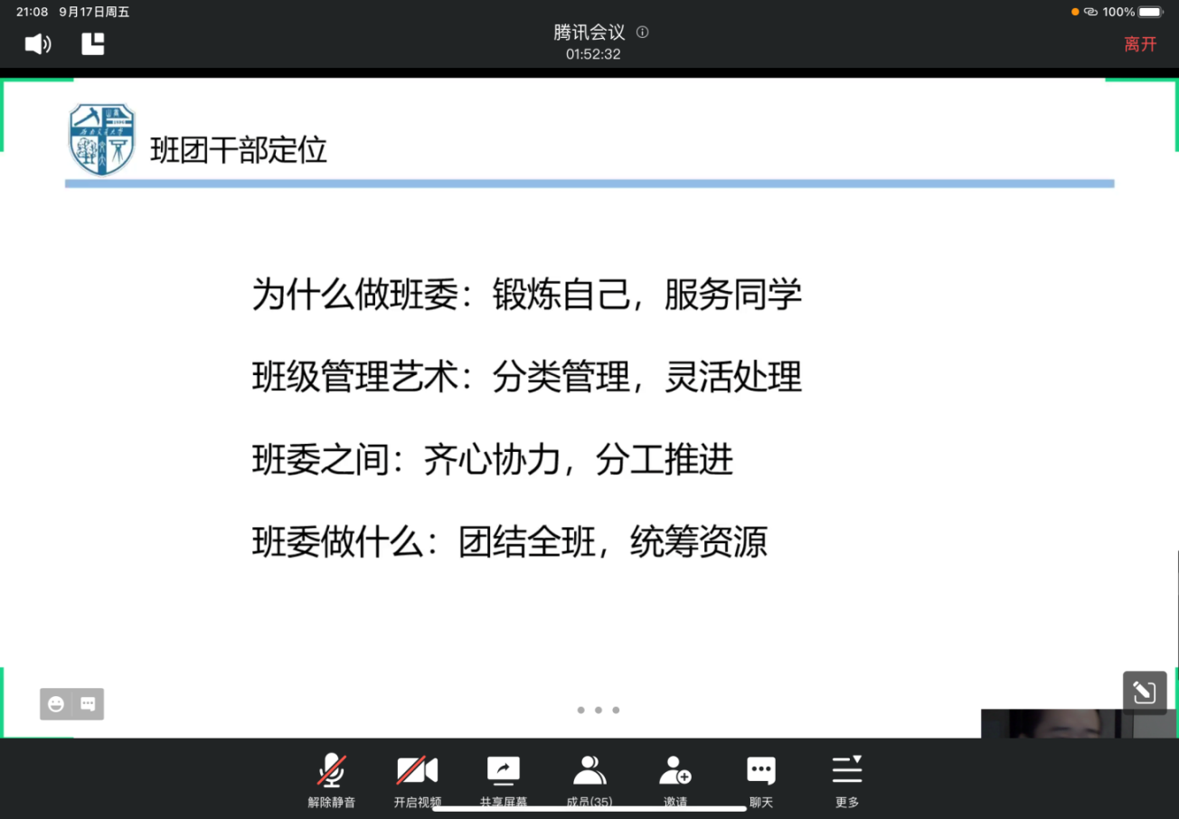 为增强我院学生干部的全局意识、服务意识、责任意识、效率意识,提高学生干部队伍整体素质。2021年9月17日晚,医学院2021级新生入学教育之班团干部培训通过线上讲座方式开展,讲座由医学院学工组副组长胡豪老师主讲,医学院辅导员黄雪梅、组织员蔡俊俊、2021级新生班委和高年级新任班委共20余名班团干部参加讲座。