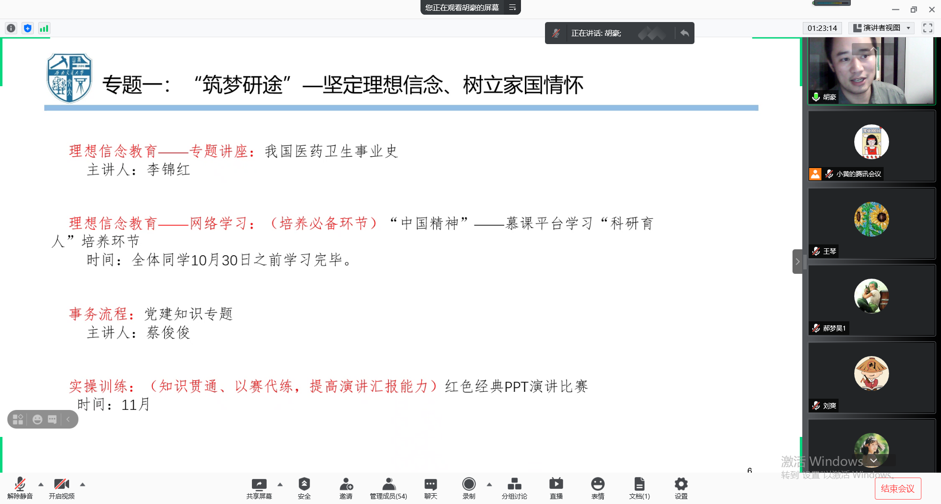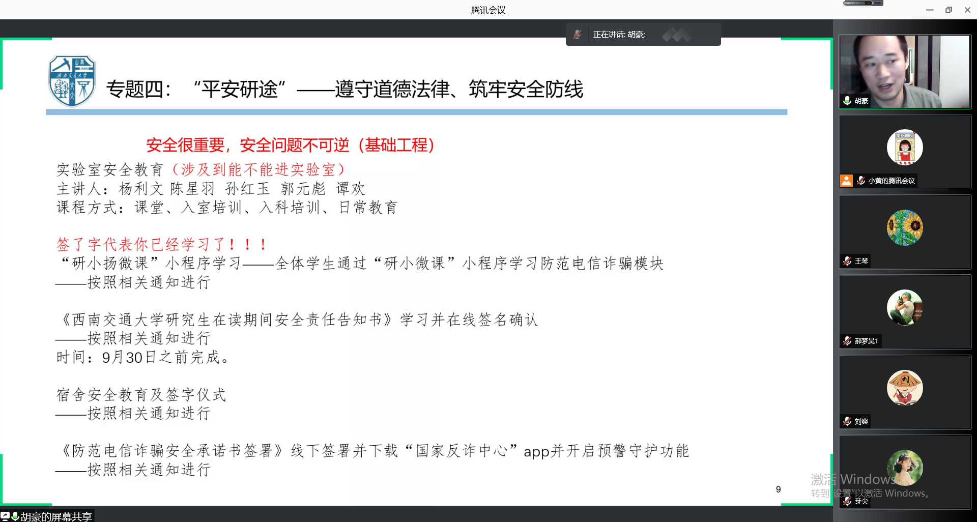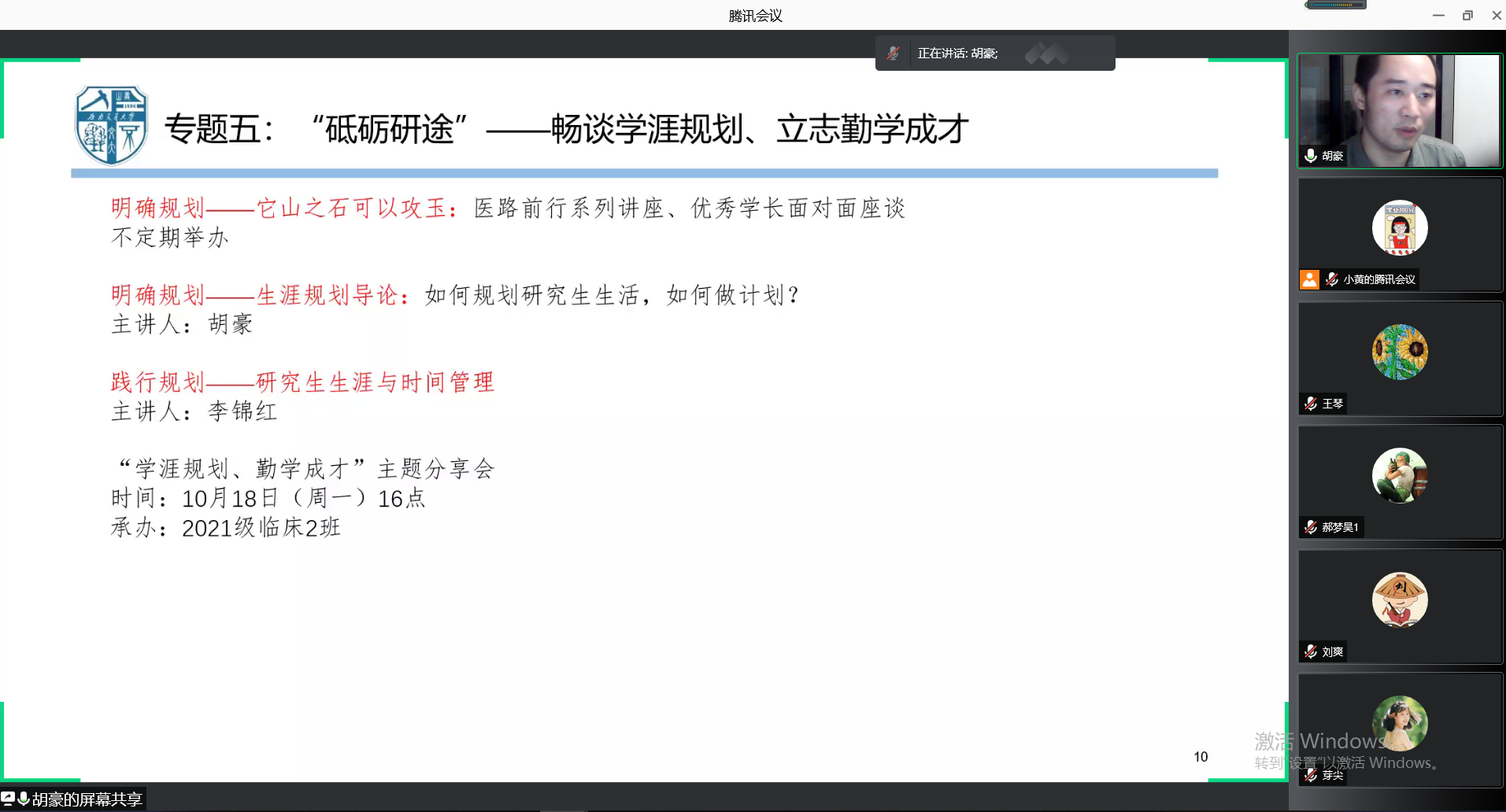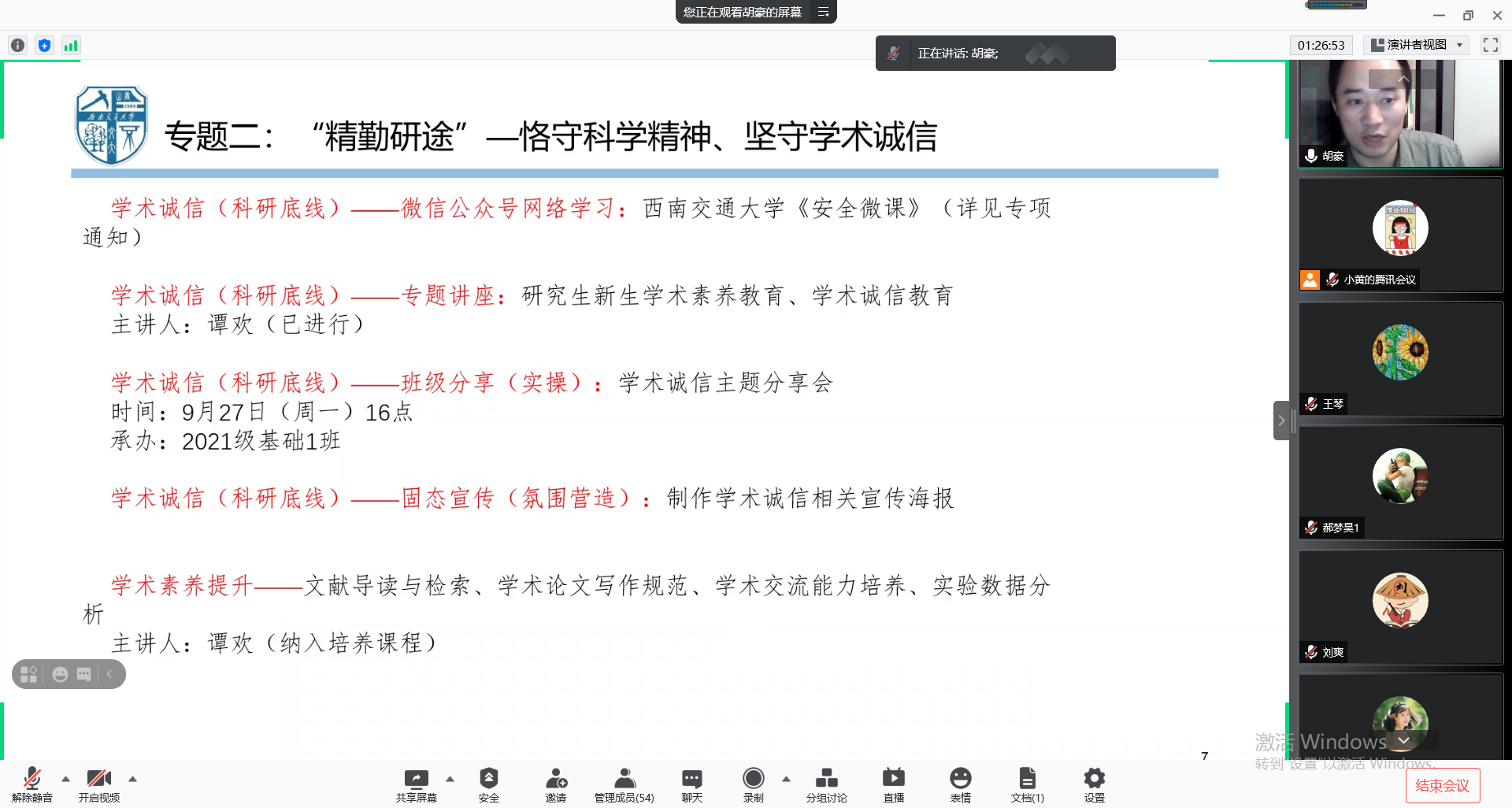 为深入学习贯彻习近平总书记“七一”重要讲话精神,深入贯彻落实习近平总书记对教育工作的重要论述精神尤其是对研究生教育工作作出的重要指示精神,以帮助研究生新生熟悉学习环境、遵守行为规范、恪守学术道德、坚定理想信念、笃定人生目标、矢志奋斗报国为指向,号召学生铭党恩、听党话、跟党走,引导学生立大志、明大德、成大才、担大任,助力提升培养质量,学院拟结合“四史”学习,围绕学校“双一流”建设和思想政治工作,聚焦有西南交通大学特色的医学生培养,开展“医路梦”新生入学系列讲座。9月17日晚,学院通过腾讯会议举行研究生新生入学教育讲座开班仪式。讲座由医学院学工组副组长胡豪主讲,医学院辅导员黄雪梅、组织员蔡俊俊、2021级全体研究生新生参与开班仪式。