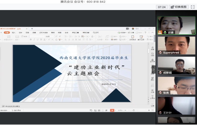 为响应学校召开“千校万岗”毕业就业精准帮扶工作推进会以及2020届毕业班“建功立业新时代”云主题班会的号召,医学院于2020年5月10日下午16时通过腾讯会议平台召开主题班会,本次会议由辅导员胡豪主持,全体毕业班研究生参会。
