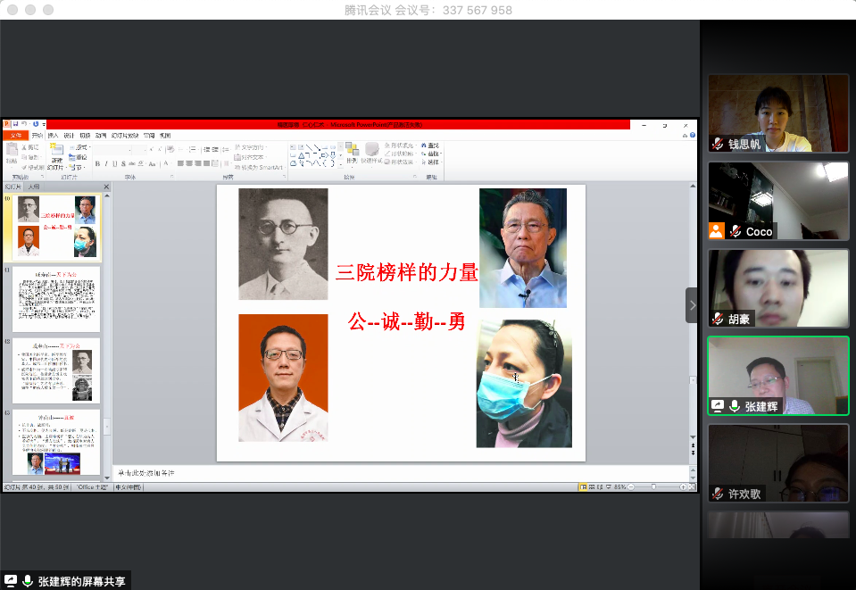 2020年5月21日晚19时,由医学院研究生会主办的“筑梦医路”系列讲座第三场——“精医厚德,仁心仁术”,通过腾讯会议平台成功开展。本次会议由辅导员胡豪主持,医学院全体研究生参会。