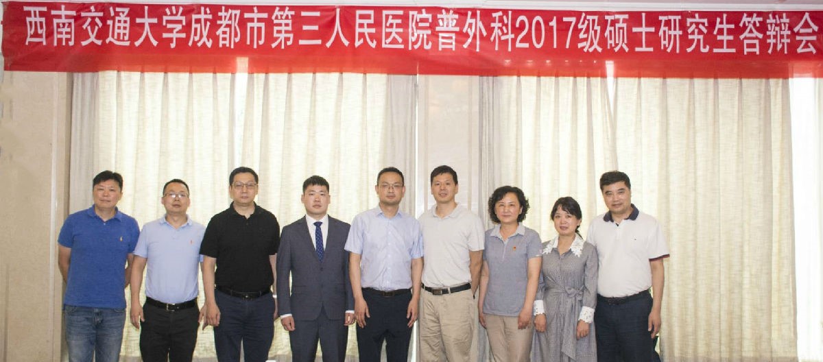 西南交通大学附属医院成都市第三人民医院普外科2017级研究生答辩会于5月28日举行,此次答辩会为西南交通大学医学院临床医学专业成立以来举行的首次毕业答辩会。答辩主席由成都市第三人民医院副院长谢江教授担任,来自四川省人民医院、成都市第二人民医院、成都市第三人民医院的多位教授任答辩委员。医学院直属党支部书记李锦红及医学院副院长、成都市第三人民医院副院长李暄受邀参会并致词。