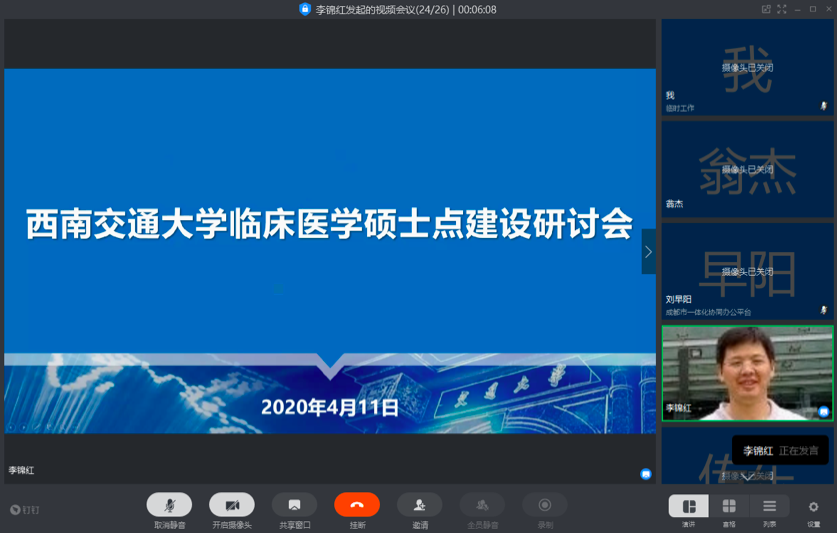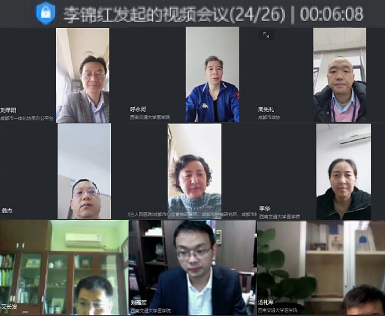 2020年4月11日上午,学院就建设临床医学一级学科硕士学位点、修订研究生培养计划等事宜进行了研究讨论。西南交通大学副校长朱健梅、研究生院常务副院长周先礼、研究生院副院长艾长发、西部战区总医院副院长呼永河、西南交通大学附属医院(成都市第三人民医院)院长刘早阳、副院长李暄、医学院党政班子成员以及各二级学科带头人参加会议。本次会议由医学院直属党支部书记李锦红主持。