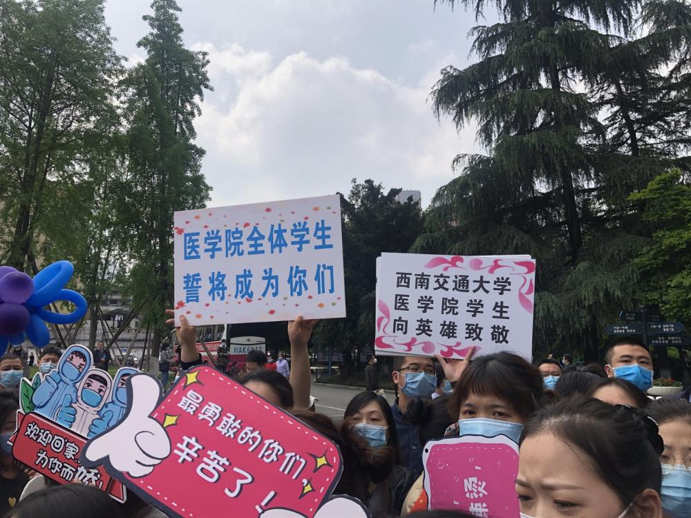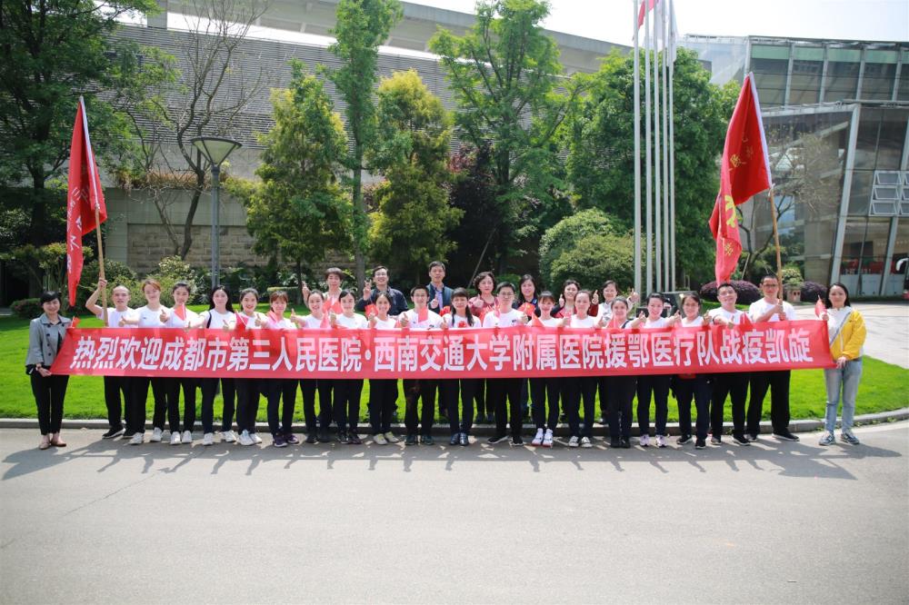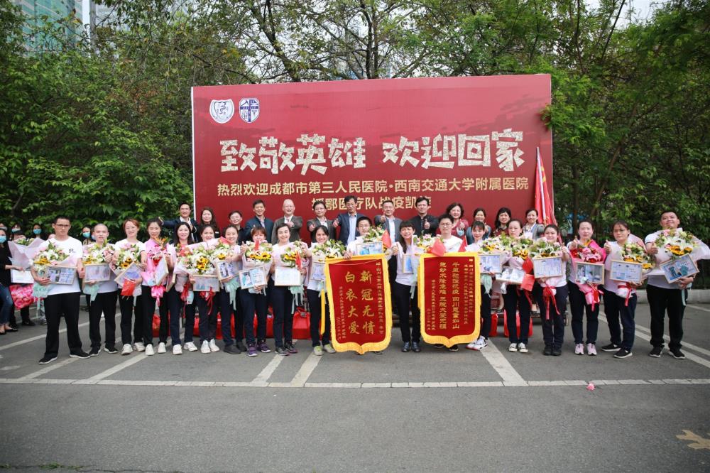 2月2日,西南交通大学附属医院(成都市第三人民医院)支援湖北医疗队赶赴武汉。59天时间里,他们持续战斗在重症患者治疗的火线,先后接诊百余位重症及危重症患者,创造出一个又一个生命奇迹。4月14日,他们正式解除为期14天的休养和医学隔离观察,胜利凯旋,和已经70多天没见的家人、同事团聚。西南交通大学党委副书记桂富强、医学院直属党支部书记李锦红、部分师生代表前往现场迎接英雄的归来。