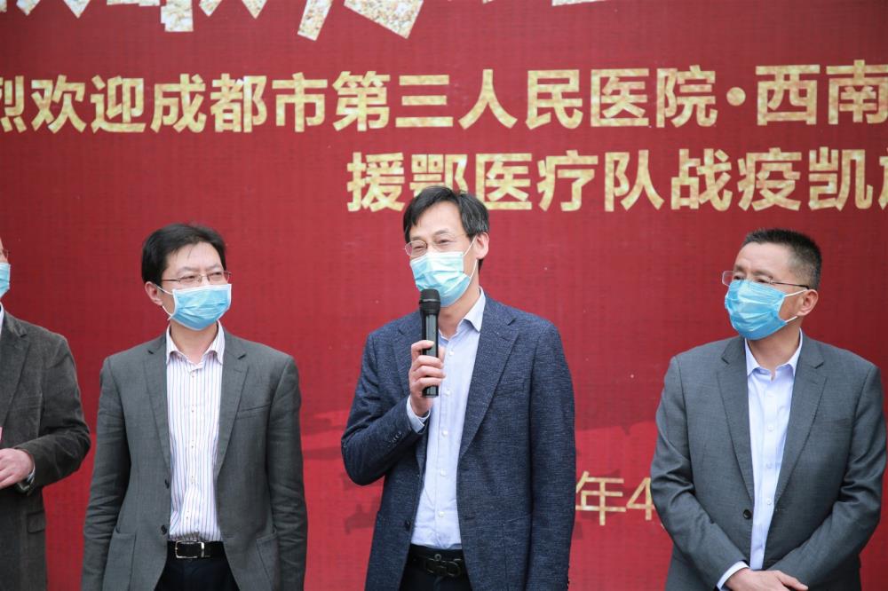 桂富强代表学校向医疗队全体队员致以最崇高的敬意,他说,今天你们平安归来,我们非常激动和感慨。学校在第一时间将你们动人的抗疫故事和壮举告诉了几十万交大人,因为你们,交大人没有缺席这场习近平总书记亲自部署、亲自指挥的伟大斗争,我们取得了阶段性胜利。因为你们,山河无恙!全体交大人为你们骄傲和自豪!西南交通大学附属医院(成都市第三人民医院)党委副书记、院长刘早阳代表医院党政班子及全院职工,点赞全队战疫英雄平安凯旋:“敬爱的英雄,亲爱的同事——欢迎回家!”
