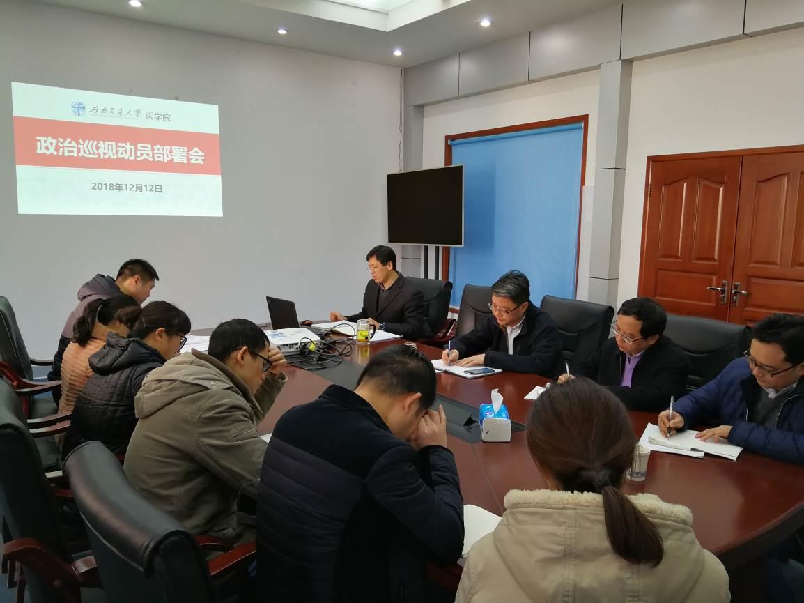2018年12月12日上午10点,我院在九里校区科技工业园B座医学院215会议室召开学校政治巡察工作动员大会,全体教职工和学生代表参加了本次动员部署会。