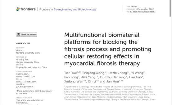 近日,医学院研究生导师侯君在Frontiers in Bioengineering and Biotechnology发表题为“Multifunctional biomaterial platforms for blocking the fibrosis process and promoting cellular restoring effects in myocardial fibrosis therapy"的综述文章(Doi:10.3389/fbioe.2022.988683)。该论文受到国家自然科学基金(81900339),成都市高水平重点学科经费及中央高校经费(26822022ZTPY052)的资助。论文第一作者为硕士研究生岳田,通讯作者为医学院研究生导师、西南交通大学附属医院(成都市第三人民医院)心内科侯君。