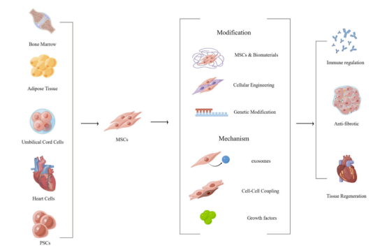 图1:MSCs的功能化修饰、MSCs对心肌纤维化的作用及机制。