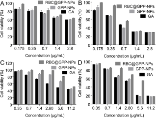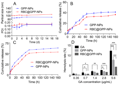 仿生纳米制剂的稳定性强于无膜纳米,且其缓释性能好,在肿瘤生长酸性环境中释放度高于无膜纳米制剂。研究结果如图2A所示,在第6天,RBC@GPP-NPs的平均粒径从98.35 nm增加到100.06 nm,增加量为1.71 nm, GPP-NPs的平均粒径从85.01 nm增加到89.7 nm,增加量为4.69 nm,这表明两种制剂在6天内都是稳定的,但仿生纳米制剂表现更好。16天后,两者的增量均小于7 nm。此外,两组PDI值在第6天后趋近于0.15,表明两种制剂均具有良好的分散性。在中性PBS(pH 7.4)中(图2B),RBC@GPP-NPs的GA最大累积释放率约为36.62%,低于GPP-NPs的41.44%。而在酸性介质(pH 5.5)中(图3C),RBC@GPP-NPs的GA最大累积释放率增加到53.25%,仍低于GPP-NPs的药物累积释放度(62.96%)。这些结果表明,仿生纳米制剂具有保持体内有效药物浓度的潜力。