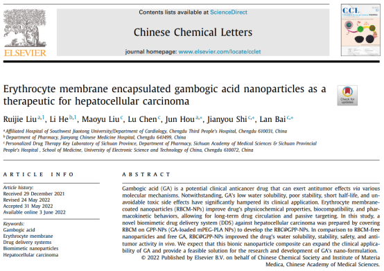 近日,医学院研究生导师侯君团队在中国化学会主办、中国医学科学院药物研究所承办的中科院Q1区SCI刊物Chinese Chemical Letters(IF:8.455)发表题为“Erythrocyte membrane encapsulated gambogic acid nanoparticles as a therapeutic for hepatocellular carcinoma”的研究。