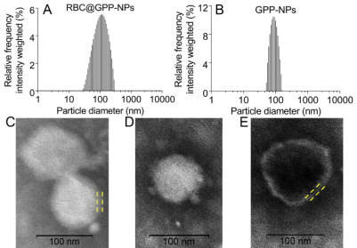 该文章采用薄膜分散法成功制备了载药无膜纳米粒GPP-NPs,而后通过物理挤压法将红细胞膜与GPP-NPs混合反复挤出制备仿生纳米制剂RBC@GPP-NPs。粒径仪及透射电镜检测结果表明此两种纳米制剂为均匀分散的颗粒状,粒径分别为102.3±3.1 nm(图1A和C)和89.55±0.92 nm(图1B和D),RBC@GPP-NPs 直径的增加大约等于 RBCM的厚度(图1C和E)。此外,RBC@GPP-NPs和GPP-NPs具有较高的包封率,分别为(79.11±1.42)%和(86.37±0.84)%,表明仿生纳米制剂可以有效地包裹药物。