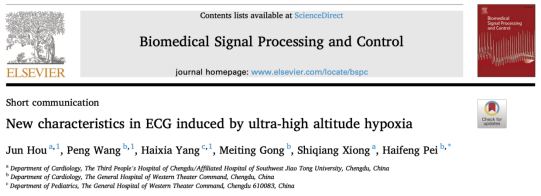 近日,医学院博士生导师裴海峰和硕士生导师侯君在《Biomedical Signal Processing and Control》期刊发表题为“New characteristics in ECG induced by ultra-high altitude hypoxia”的文章(IF:5.076)。该篇论文的第一作者为西南交通大学医学院硕士研究生导师/西南交通大学附属医院(成都市第三人民医院)心内科侯君,通讯作者为西南交通大学医学院博士研究生导师/西南交通大学附属医院(西部战区总医院)心内科裴海峰。