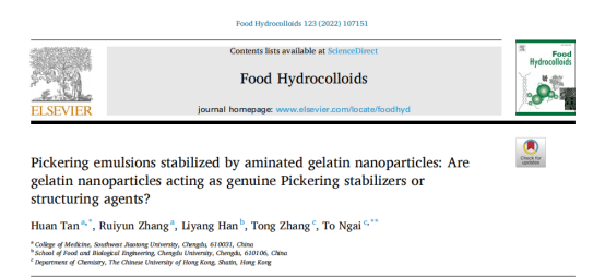 近日,应用化学和食品科技顶级期刊《Food Hydrocolloids》(IF:9.147)在线发表了西南交通大学医学院翁杰课题组谭欢副教授的研究成果《Pickering emulsions stabilized by aminated gelatin nanoparticles: Are gelatin nanoparticles acting as genuine Pickering stabilizers or structuring agents?》。本论文受到国家自然科学基金项目(21802009)、四川省科技厅基础应用研究项目(2018JY0611)以及中央高校基本科研业务费创新项目(2682020ZT93、2682021CX101)的资助。论文的第一作者和通讯作者为谭欢副教授,香港中文大学Ngai To教授为共同通讯作者。硕士研究生张瑞云也参与了部分工作。