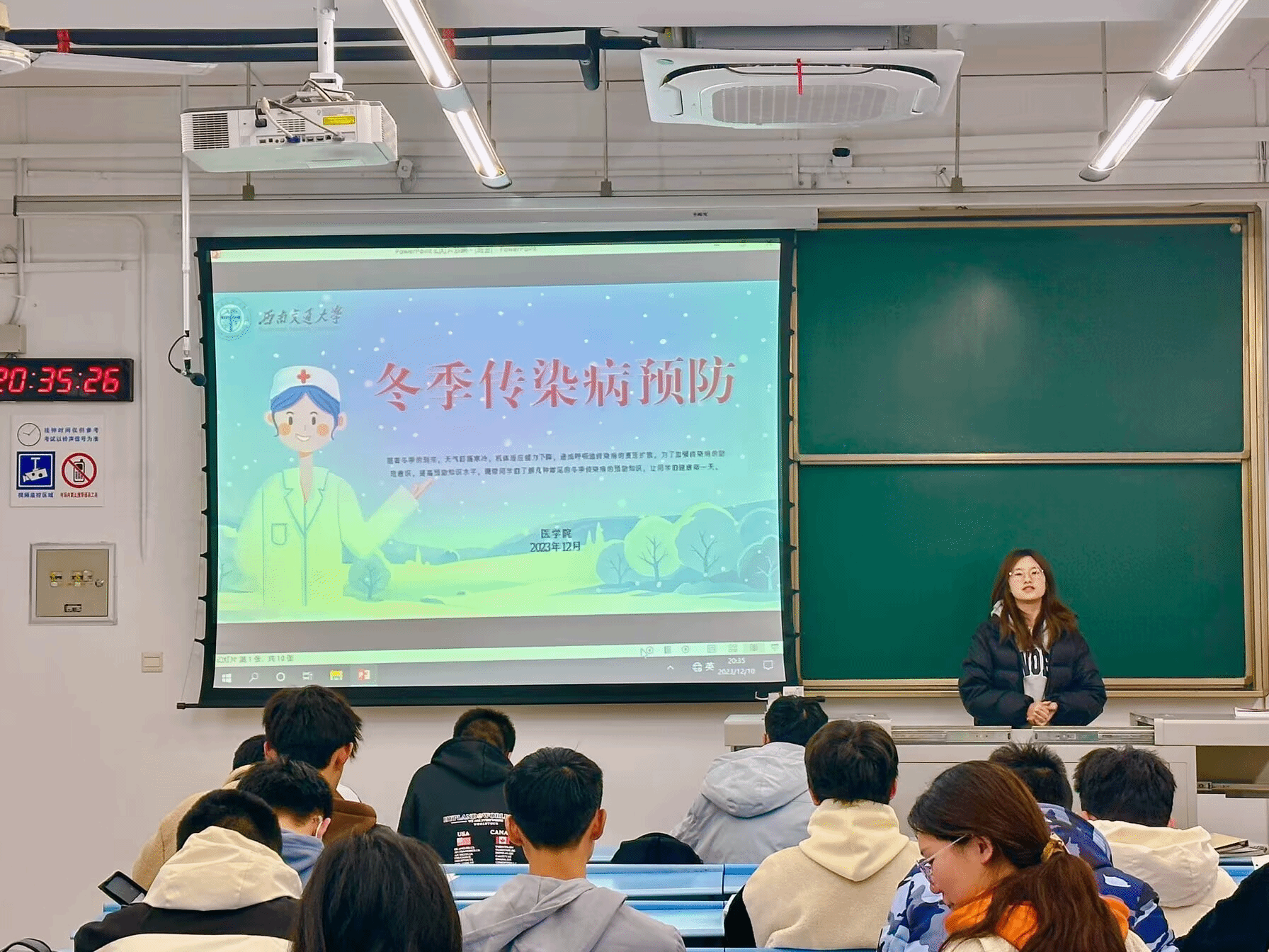在冬季预防传染病方面,靳涵老师首先介绍了冬季常见的传染病,如流感、感冒、肺炎等,并强调了个人卫生习惯的重要性。入冬以来,全国多地进入呼吸道疾病高发期,并且呈现多种病原体共同或交替流行态势。她提醒同学们,尤其是2020级考研的学生,一定要做好自身的防护,平时适当锻炼,增强体质,以饱满的精神状态和健康的身体素质迎接考研。2021级最近许多同学都出现了流感请假的状况,已经生病的同学要注意休息,及时治疗;未生病的同学要做好自身防护,勤加锻炼。针对低年级同学,王川玲老师强调宿舍卫生的重要性,要重视每月一次的“生医大扫除”,宿舍平时也要保持通风,勤打扫。她建议同学们可以采取多种防范措施,如锻炼身体、戴好口罩等降低感染风险,保障身体健康。如果出现发热、咳嗽等症状,应主动就医并告知医生近期接触过的人群,保障自身及他人安全。