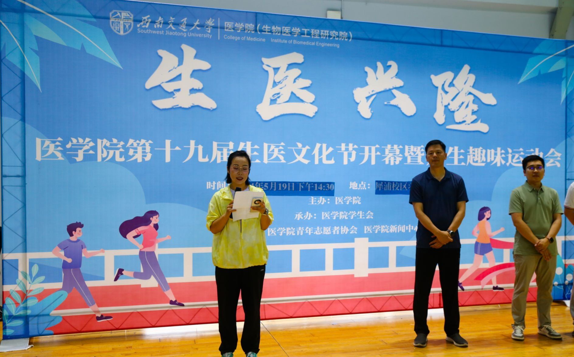 夏风拂面,阳光明媚,医学院迎来了“生医兴隆”第十九届生医文化节。本次文化节贯彻“五育并举,立德树人”的教育方针,展示了医学院学生风采,促进了师生交流,增进了师生感情。生医文化节开幕式在犀浦校区羽毛球馆隆重举行,,学院党委书记李锦红、党委副书记于楠、生医系主任向韬、团委书记胡豪、学院教师智伟、以及辅导员靳涵、王川玲、张佳豪出席本次活动。
