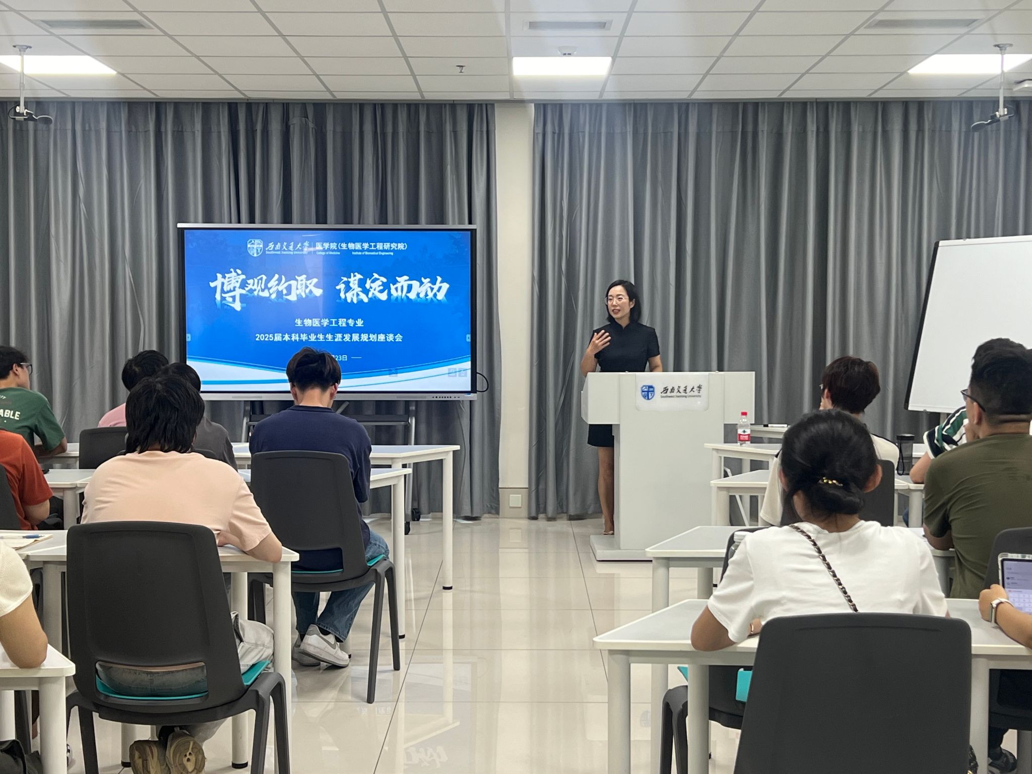 高校毕业生就业是教育、科技、人才融合发展的重要支撑,立德树人工程的重要内容,促进人才培养供需适配的重要突破口。医学院始终牢固树立“就业育人”理念,结合学院学科专业特点、学生需求,全员、全过程、全方位推进生物医学工程专业2025届本科毕业生升学与就业。5月23日15时,医学院在X30384开展了“博观约取,谋定而动”生物医学工程专业2025届本科毕业生生涯发展座谈会。本次座谈会邀请了医学院副院长冷永祥教授、党委副书记于楠以及团委书记胡豪,共同为毕业生们提供升学指导、就业分析和信息搜集与资源获取的专题辅导,于楠副书记主持会议。