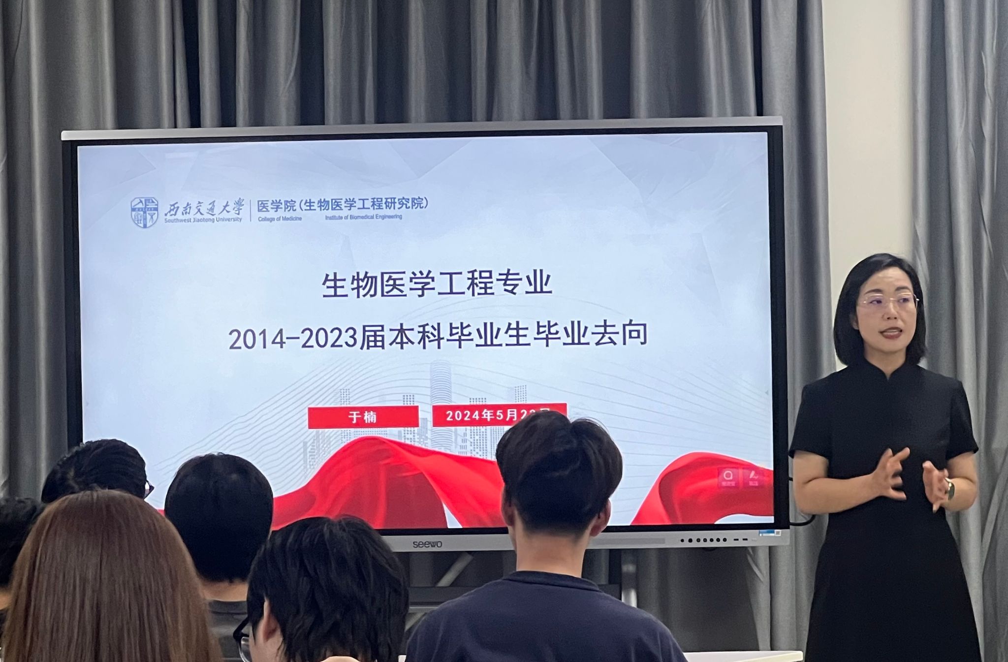 为帮助2025届同学对生物医学工程专业的毕业去向有更深入的了解,医学院党委副书记于楠为同学们带来了生物医学工程专业近十年来的升学与就业情况分析。她通过详实的数据和案例,展示了生物医学工程专业毕业生在升学深造和就业市场上的优势和竞争力。于楠副书记还就当前就业市场的趋势和用人单位的需求进行了讲解,为同学们提供了宝贵的就业建议。