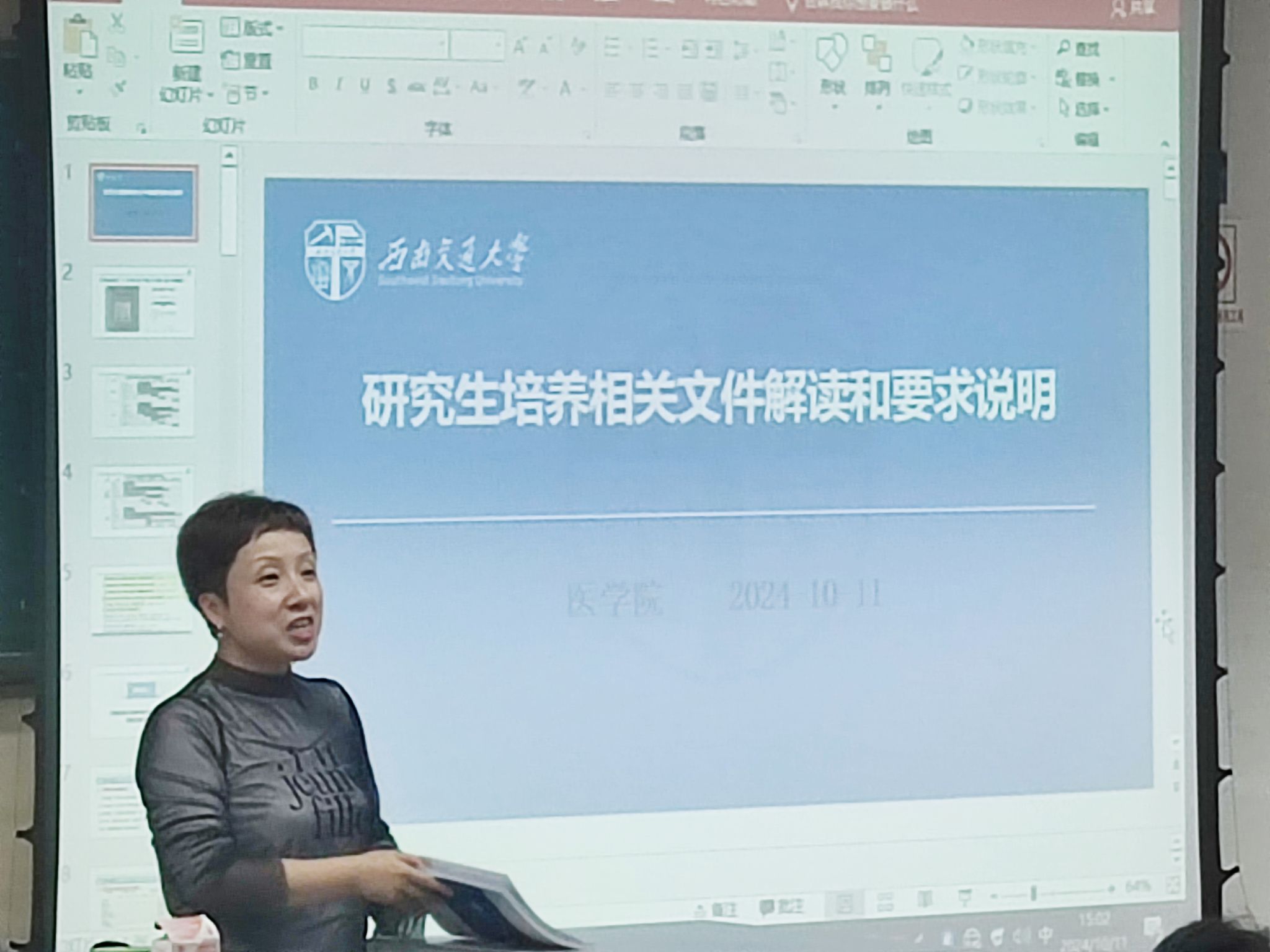 2024年10月11日,下午14时50分至17时10分,在西南交通大学九里校区4417教室,学院研究生教务刘柯宏老师为医学院2024级新生带来了一场详尽而生动的研究生培养相关文件解读和要求说明讲座。此次讲座旨在帮助同学们更好地理解学校的培养方案以及学位与研究生教育工作的相关政策文件,确保每位同学都能顺利推进自己的学术生涯。