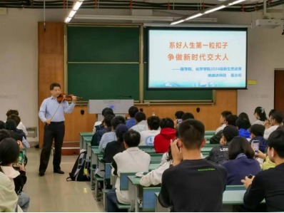 为使新生深入了解交大的历史变迁和独特文化,传承历史之下不熄不灭的交大精神,2024年10月11日下午14:30,医学院与化学学院邀请到了西南交大晚晴讲师团的葛永明老师于X4158教室为2024级全体新生进行了交大校史校情为专题讲座教育。葛永明老师以“系好人生第一粒扣子,争做新时代交大人”为题,以历史脉络为线索,以时代背景为导向,系统性地讲解了我校的发展进程和卓越成就,并通过介绍詹天佑、茅以升等知名校友的故事,向新生传递历史赓续下的交大精神。