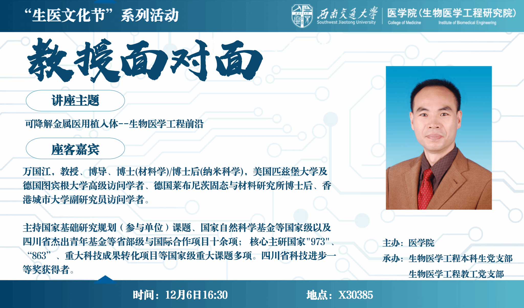 医学院第四期“教授面对面”活动于12月6日下午16:30分在X30385举行,本次活动邀请到了医学院万国江教授。万教授以“可降解金属医用植入体——生物医学工程前沿”为题,与同学们就生物医学工程领域的实践与发展进行了深入的交流与探讨。