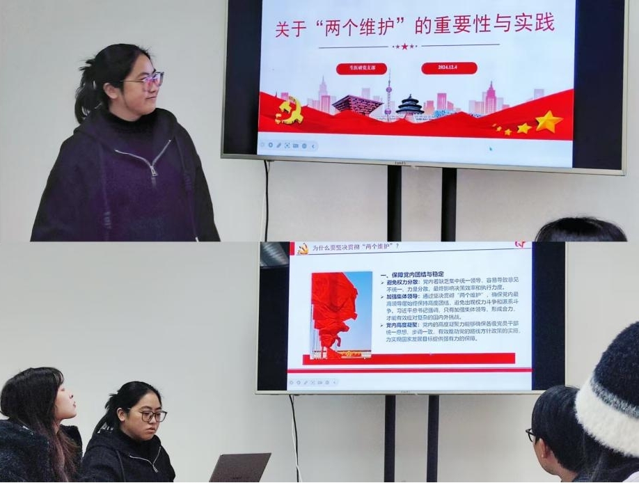 2024年12月4日,医学院研究生会联动生医研党支部在医学院A座215会议室,共同就“两个维护”的重要性与实践进行了深入的交流。“两个维护”即坚决维护习近平总书记党中央的核心、全党的核心地位,坚决维护党中央权威和集中统一领导。党支部成员们一致认为,“两个维护”不仅是全体党员的基本政治责任,也是保证党和国家前途命运、人民幸福安康的根本所在。此外,他们还分享了自己在科研工作中的心得体会,表示将积极把“两个维护”融入具体的科研实践中去,以实际行动支持党和国家的发展大计,把“论文写在祖国大地上”。