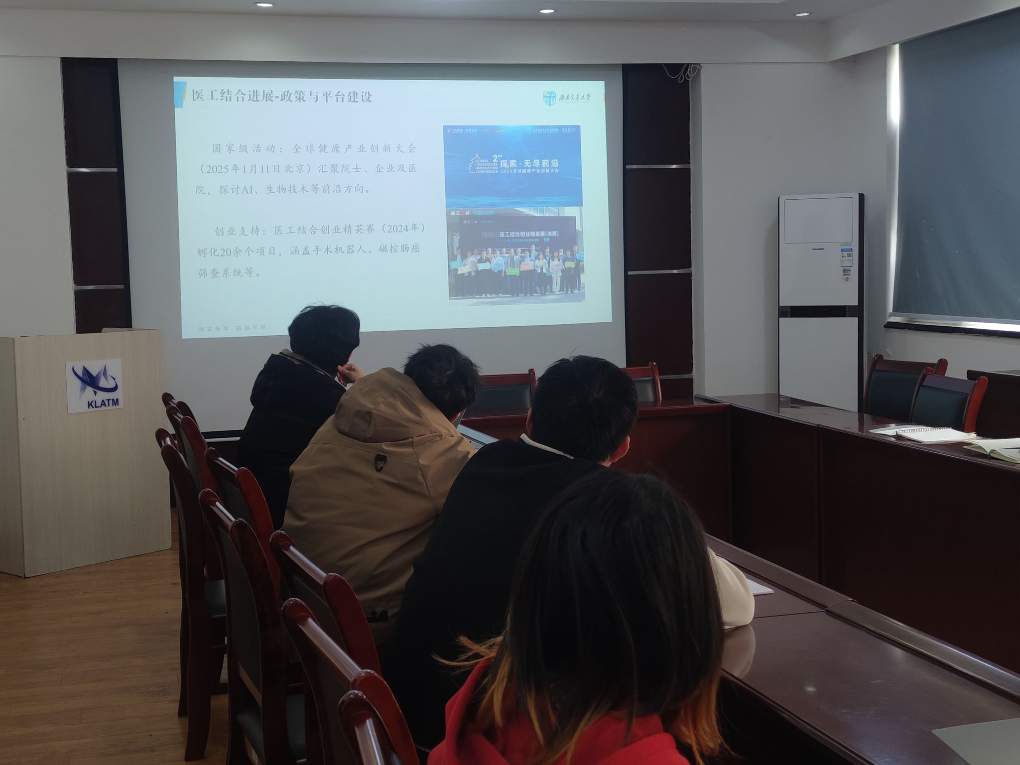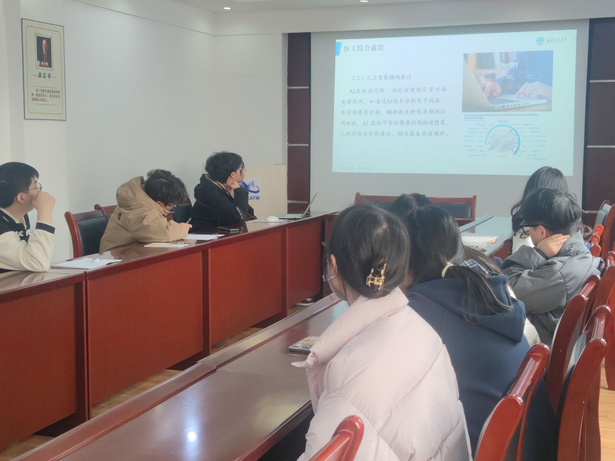 为了解生物医学工程领域的前沿发展,加强同学之间学术交流与实践探索的热情,2025年3月14日,在九里校区医学院 A204会议室,一场以“医工结合前沿知识探索之旅”为主题的理论学习活动如约而至,本次活动由活动部何思汝同学主持,医学院研究生会全体成员以及研究生会指导老师韩鹏飞老师参与其中,共同探索医工结合的魅力。