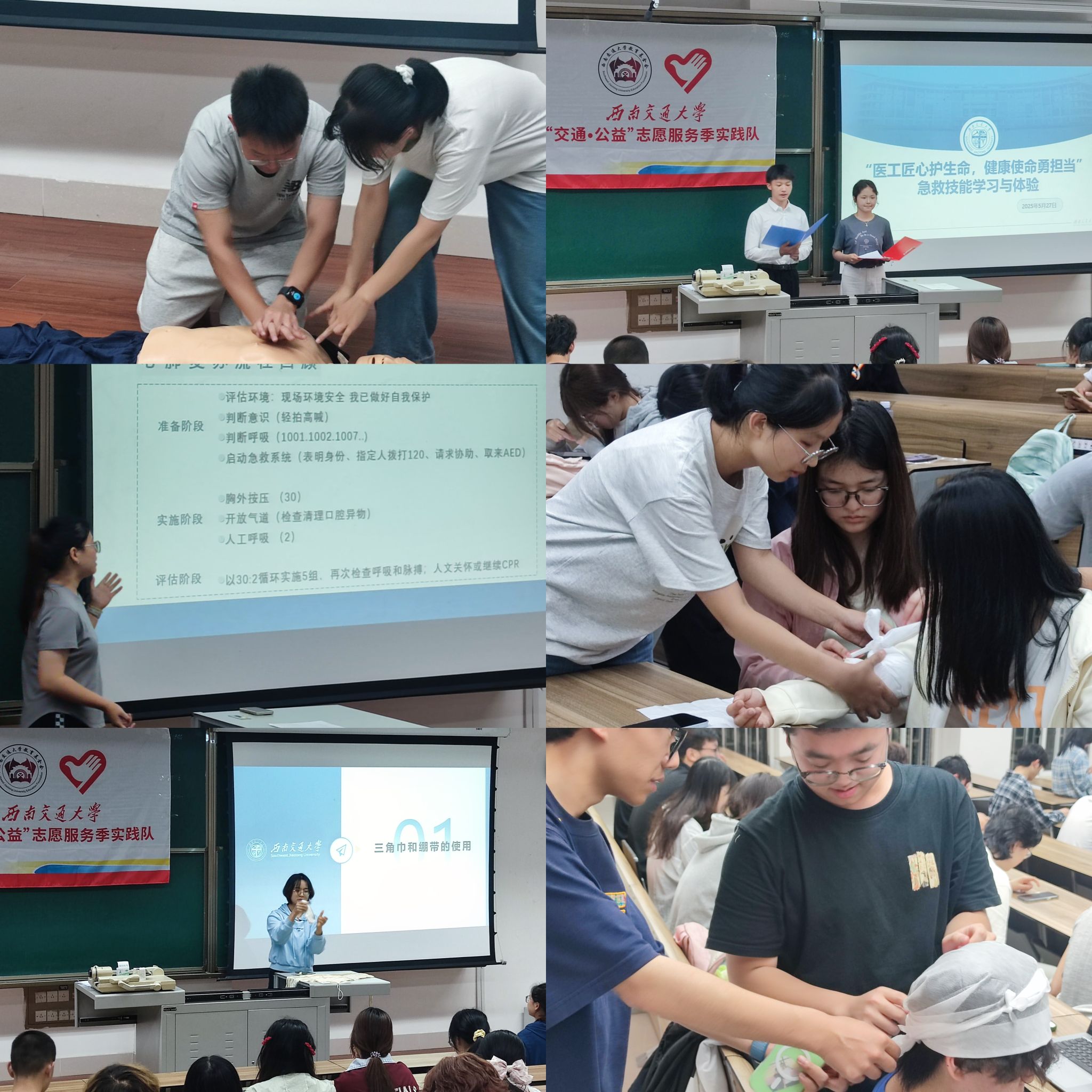 5月25 日上午10:30,由医学院与建筑学院承办的第二期活动,在犀浦校区报告厅A100(八教一楼中庭)准时拉开帷幕。活动邀请到红十字会学生分会副会长邓宇为同学们进行急救知识与技能培训。培训内容涵盖心肺复苏、自动体外除颤器(AED)使用、创伤急救等核心技能,采用理论授课与模拟演练相结合的方式,让学员们在掌握理论知识的同时,能够在实践中提升操作能力。授课老师首先详细讲解了三角巾和绷带的多种使用方法,包括环形包扎、螺旋包扎、“8 字”包扎等,针对不同的创伤场景,深入浅出地介绍了每种包扎方法的适用情况和作用。随后,通过视频演示和现场示范,细致地展示了心肺复苏的整个流程,从判断现场环境安全到胸外按压、开放气道、人工呼吸等每一个步骤,都进行了详细的讲解,并强调了操作过程中的注意事项。在模拟演练环节,同学们积极参与,在专业指导下进行实际操作,亲身体验急救过程,加深了对急救技能的理解和掌握。