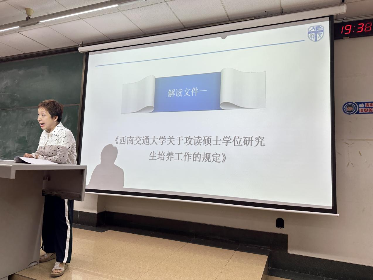 接着,刘老师深入解析了几份关键性文件,包括但不限于《西南交通大学关于攻读硕士学位研究生培养工作的规定》、《西南交通大学关于攻读博士学位研究生培养工作的规定》以及《西南交通大学研究生培养过程管理与质量督导实施办法》等。通过对这些规定的细致解读,不仅让同学们明确了课程学习的具体要求如时间安排、学分获取标准等内容,同时也加深了大家对整个研究生期间自我管理和规划的认识。