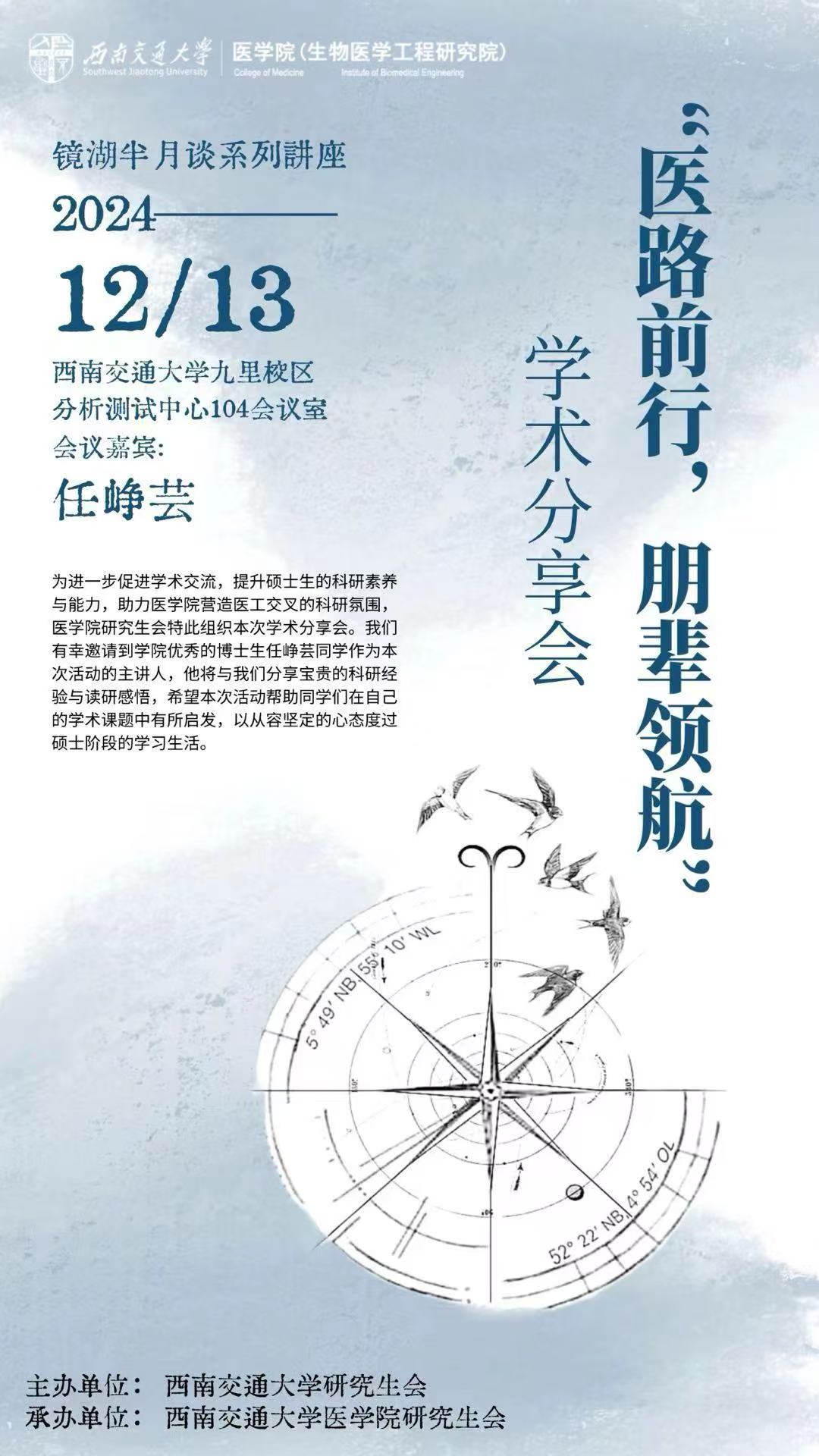 内容:为进一步促进学术交流,提升硕士生的科研素养与能力,助力医学院营造医工交叉的科研氛围。医学院研究生会特邀请学院优秀博士生代表任峥芸为同学们分享科研经验与读研感悟。