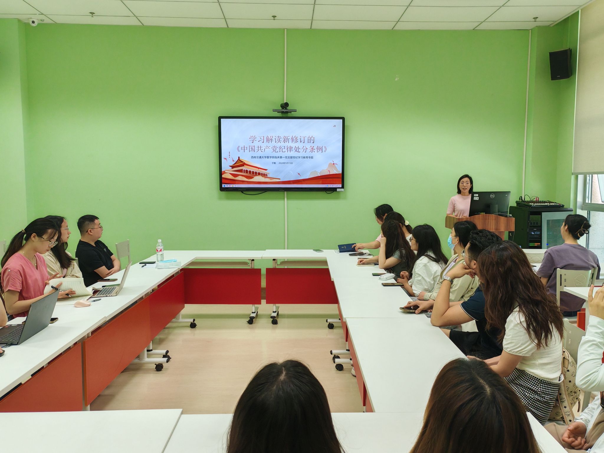 5月13日上午11:00,西南交通大学医学院在成都市第三人民医院2号楼开展纪委书记讲纪律党课暨临床第一党支部“学条例 守党纪 强党性”主题党日活动。学院党委书记李锦红,党委副书记、纪委书记于楠,学工组副组长、团委书记胡豪出席了活动,临床第一党支部全体学生党员、入党积极分子参加了此次活动。活动由党支部书记王森林同志主持。