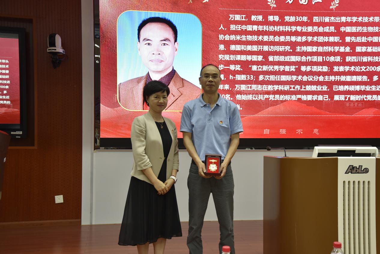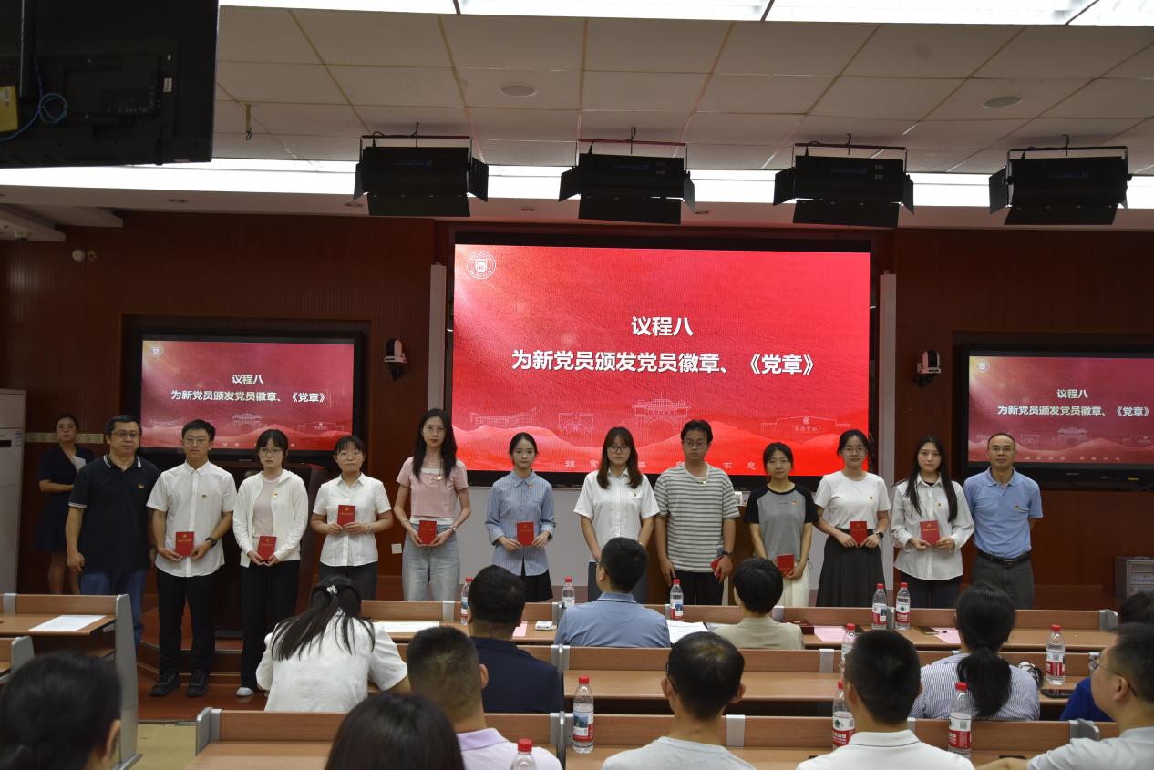 大会第二阶段,举行党员宣誓仪式。党委书记曾东红宣读了《中共西南交通大学医学院委员会关于同意接收预备党员的批复》,冷永祥、万国江两位在党三十年的老党员同志为新党员佩戴党员徽章并颁发《中国共产党章程》。